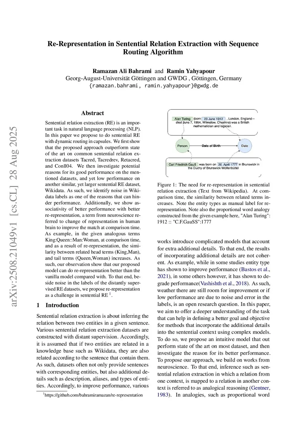 Sentential relation extraction (RE) is an important task in natural language processing (NLP). In this paper we propose to do sentential RE with dynamic routing in capsules. We first show that the proposed approach outperform state of the art on common sentential relation extraction datasets Tacred, Tacredrev, Retacred, and Conll04. We then investigate potential reasons for its good performance on the mentioned datasets, and yet low performance on another similar, yet larger sentential RE dataset, Wikidata. As such, we identify noise in Wikidata labels as one of the reasons that can hinder performance. Additionally, we show associativity of better performance with better re-representation, a term from neuroscience referred to change of representation in human brain to improve the match at comparison time. As example, in the given analogous terms King:Queen::Man:Woman, at comparison time, and as a result of re-representation, the similarity between related head terms (King,Man), and tail terms (Queen,Woman) increases. As such, our observation show that our proposed model can do re-representation better than the vanilla model compared with. To that end, beside noise in the labels of the distantly supervised RE datasets, we propose re-representation as a challenge in sentential RE.
