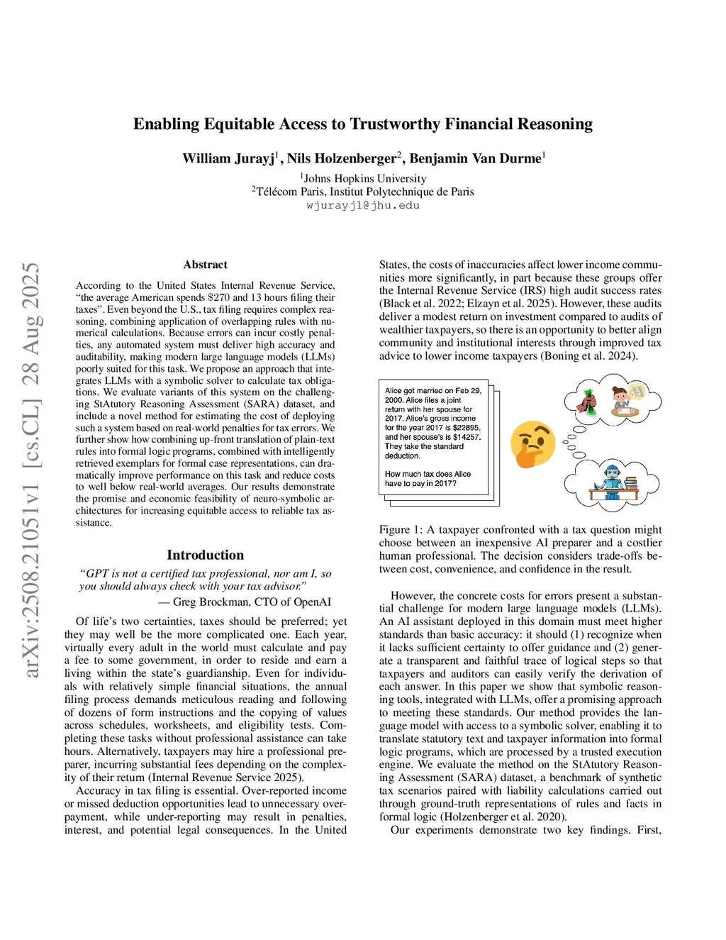 According to the United States Internal Revenue Service, ``the average American spends \270$ and 13 hours filing their taxes''. Even beyond the U.S., tax filing requires complex reasoning, combining application of overlapping rules with numerical calculations. Because errors can incur costly penalties, any automated system must deliver high accuracy and auditability, making modern large language models (LLMs) poorly suited for this task. We propose an approach that integrates LLMs with a symbolic solver to calculate tax obligations. We evaluate variants of this system on the challenging StAtutory Reasoning Assessment (SARA) dataset, and include a novel method for estimating the cost of deploying such a system based on real-world penalties for tax errors. We further show how combining up-front translation of plain-text rules into formal logic programs, combined with intelligently retrieved exemplars for formal case representations, can dramatically improve performance on this task and reduce costs to well below real-world averages. Our results demonstrate the effectiveness of applying semantic parsing methods to statutory reasoning, and show promising economic feasibility of neuro-symbolic architectures for increasing access to reliable tax assistance.