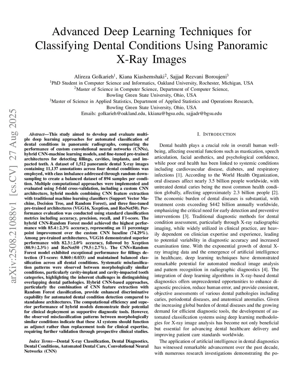 This study investigates deep learning methods for automated classification of dental conditions in panoramic X-ray images. A dataset of 1,512 radiographs with 11,137 expert-verified annotations across four conditions fillings, cavities, implants, and impacted teeth was used. After preprocessing and class balancing, three approaches were evaluated: a custom convolutional neural network (CNN), hybrid models combining CNN feature extraction with traditional classifiers, and fine-tuned pre-trained architectures. Experiments employed 5 fold cross validation with accuracy, precision, recall, and F1 score as evaluation metrics. The hybrid CNN Random Forest model achieved the highest performance with 85.4% accuracy, surpassing the custom CNN baseline of 74.3%. Among pre-trained models, VGG16 performed best at 82.3% accuracy, followed by Xception and ResNet50. Results show that hybrid models improve discrimination of morphologically similar conditions and provide efficient, reliable performance. These findings suggest that combining CNN-based feature extraction with ensemble classifiers offers a practical path toward automated dental diagnostic support, while also highlighting the need for larger datasets and further clinical validation.