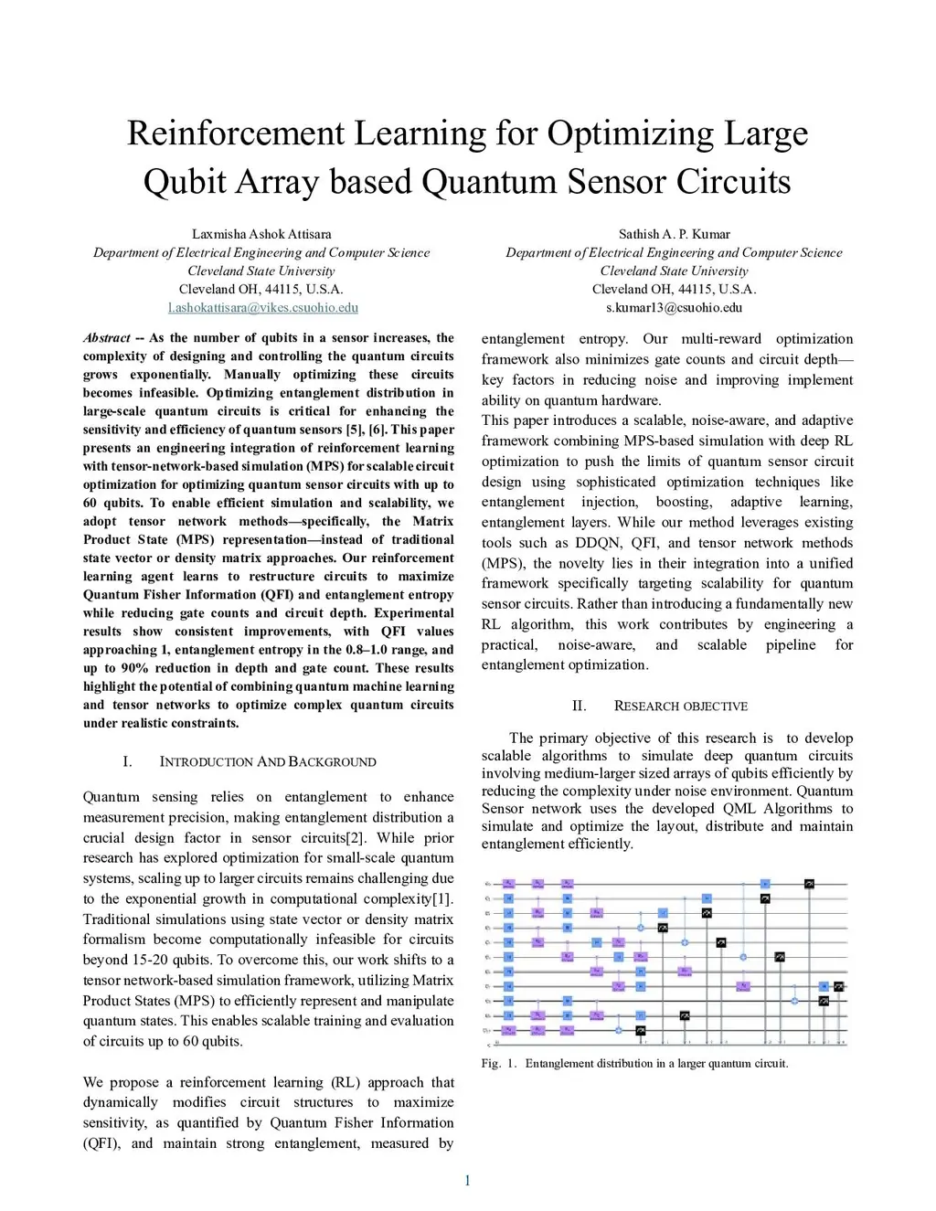 As the number of qubits in a sensor increases, the complexity of designing and controlling the quantum circuits grows exponentially. Manually optimizing these circuits becomes infeasible. Optimizing entanglement distribution in large-scale quantum circuits is critical for enhancing the sensitivity and efficiency of quantum sensors [5], [6]. This paper presents an engineering integration of reinforcement learning with tensor-network-based simulation (MPS) for scalable circuit optimization for optimizing quantum sensor circuits with up to 60 qubits. To enable efficient simulation and scalability, we adopt tensor network methods, specifically the Matrix Product State (MPS) representation, instead of traditional state vector or density matrix approaches. Our reinforcement learning agent learns to restructure circuits to maximize Quantum Fisher Information (QFI) and entanglement entropy while reducing gate counts and circuit depth. Experimental results show consistent improvements, with QFI values approaching 1, entanglement entropy in the 0.8-1.0 range, and up to 90% reduction in depth and gate count. These results highlight the potential of combining quantum machine learning and tensor networks to optimize complex quantum circuits under realistic constraints.