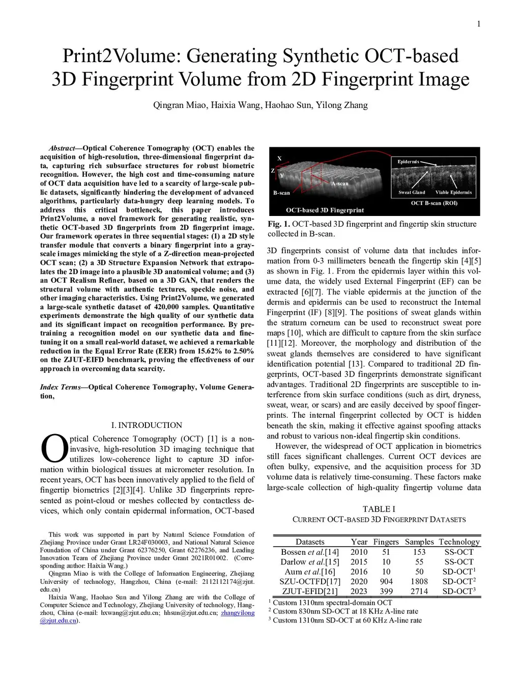 Optical Coherence Tomography (OCT) enables the acquisition of high-resolution, three-dimensional fingerprint data, capturing rich subsurface structures for robust biometric recognition. However, the high cost and time-consuming nature of OCT data acquisition have led to a scarcity of large-scale public datasets, significantly hindering the development of advanced algorithms, particularly data-hungry deep learning models. To address this critical bottleneck, this paper introduces Print2Volume, a novel framework for generating realistic, synthetic OCT-based 3D fingerprints from 2D fingerprint image. Our framework operates in three sequential stages: (1) a 2D style transfer module that converts a binary fingerprint into a grayscale images mimicking the style of a Z-direction mean-projected OCT scan; (2) a 3D Structure Expansion Network that extrapolates the 2D im-age into a plausible 3D anatomical volume; and (3) an OCT Realism Refiner, based on a 3D GAN, that renders the structural volume with authentic textures, speckle noise, and other imaging characteristics. Using Print2Volume, we generated a large-scale synthetic dataset of 420,000 samples. Quantitative experiments demonstrate the high quality of our synthetic data and its significant impact on recognition performance. By pre-training a recognition model on our synthetic data and fine-tuning it on a small real-world dataset, we achieved a remarkable reduction in the Equal Error Rate (EER) from 15.62% to 2.50% on the ZJUT-EIFD benchmark, proving the effectiveness of our approach in overcoming data scarcity.