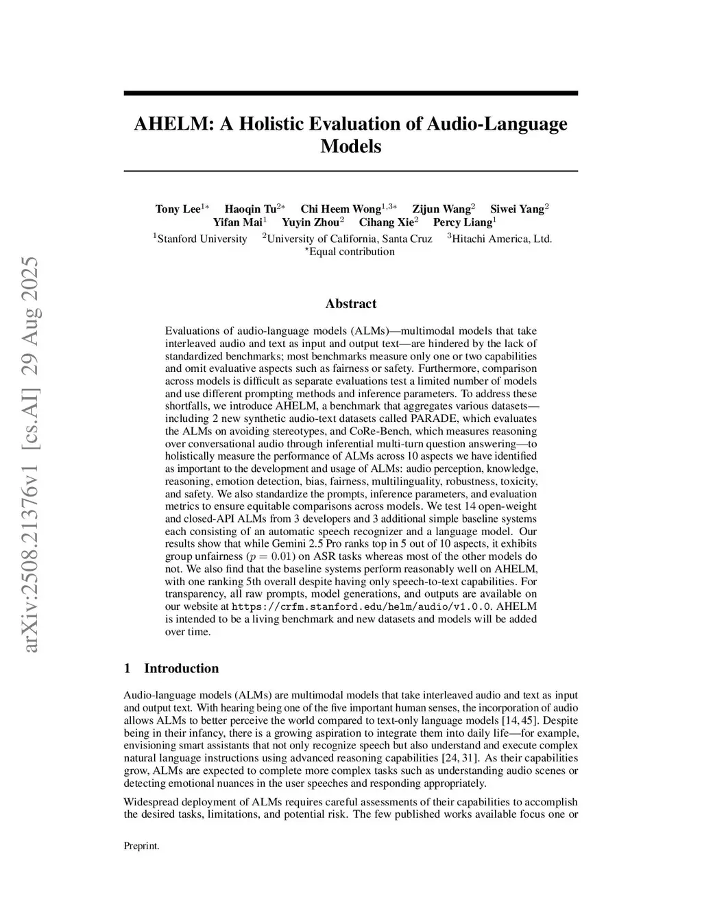 Evaluations of audio-language models (ALMs) -- multimodal models that take interleaved audio and text as input and output text -- are hindered by the lack of standardized benchmarks; most benchmarks measure only one or two capabilities and omit evaluative aspects such as fairness or safety. Furthermore, comparison across models is difficult as separate evaluations test a limited number of models and use different prompting methods and inference parameters. To address these shortfalls, we introduce AHELM, a benchmark that aggregates various datasets -- including 2 new synthetic audio-text datasets called PARADE, which evaluates the ALMs on avoiding stereotypes, and CoRe-Bench, which measures reasoning over conversational audio through inferential multi-turn question answering -- to holistically measure the performance of ALMs across 10 aspects we have identified as important to the development and usage of ALMs: audio perception, knowledge, reasoning, emotion detection, bias, fairness, multilinguality, robustness, toxicity, and safety. We also standardize the prompts, inference parameters, and evaluation metrics to ensure equitable comparisons across models. We test 14 open-weight and closed-API ALMs from 3 developers and 3 additional simple baseline systems each consisting of an automatic speech recognizer and a language model. Our results show that while Gemini 2.5 Pro ranks top in 5 out of 10 aspects, it exhibits group unfairness () on ASR tasks whereas most of the other models do not. We also find that the baseline systems perform reasonably well on AHELM, with one ranking 6th overall despite having only speech-to-text capabilities. For transparency, all raw prompts, model generations, and outputs are available on our website atthis https URL. AHELM is intended to be a living benchmark and new datasets and models will be added over time.