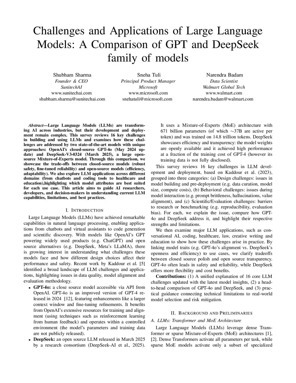 Challenges and Applications of Large Language Models: A Comparison of GPT and DeepSeek family of models