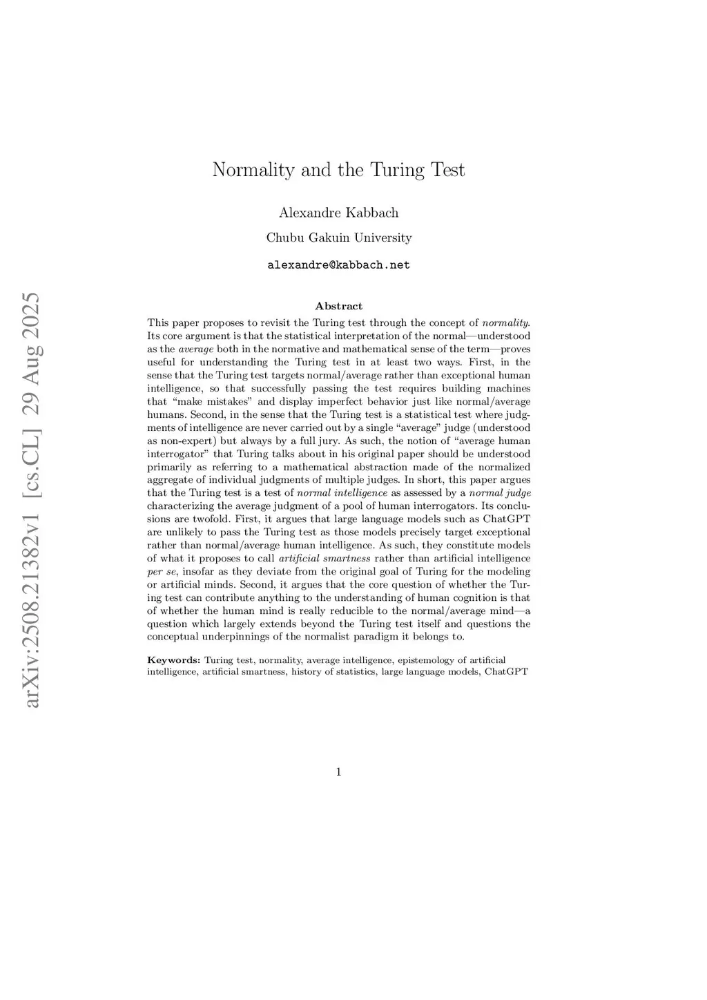 This paper proposes to revisit the Turing test through the concept of normality. Its core argument is that the Turing test is a test of normal intelligence as assessed by a normal judge. First, in the sense that the Turing test targets normal/average rather than exceptional human intelligence, so that successfully passing the test requires machines to "make mistakes" and display imperfect behavior just like normal/average humans. Second, in the sense that the Turing test is a statistical test where judgments of intelligence are never carried out by a single "average" judge (understood as non-expert) but always by a full jury. As such, the notion of "average human interrogator" that Turing talks about in his original paper should be understood primarily as referring to a mathematical abstraction made of the normalized aggregate of individual judgments of multiple judges. Its conclusions are twofold. First, it argues that large language models such as ChatGPT are unlikely to pass the Turing test as those models precisely target exceptional rather than normal/average human intelligence. As such, they constitute models of what it proposes to call artificial smartness rather than artificial intelligence, insofar as they deviate from the original goal of Turing for the modeling of artificial minds. Second, it argues that the objectivization of normal human behavior in the Turing test fails due to the game configuration of the test which ends up objectivizing normative ideals of normal behavior rather than normal behavior per se.