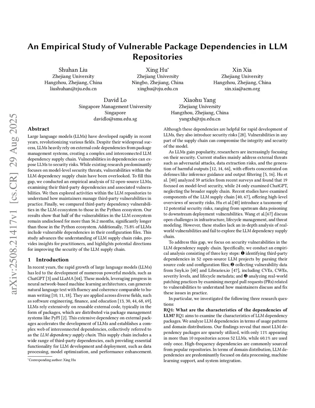 Large language models (LLMs) have developed rapidly in recent years, revolutionizing various fields. Despite their widespread success, LLMs heavily rely on external code dependencies from package management systems, creating a complex and interconnected LLM dependency supply chain. Vulnerabilities in dependencies can expose LLMs to security risks. While existing research predominantly focuses on model-level security threats, vulnerabilities within the LLM dependency supply chain have been overlooked. To fill this gap, we conducted an empirical analysis of 52 open-source LLMs, examining their third-party dependencies and associated vulnerabilities. We then explored activities within the LLM repositories to understand how maintainers manage third-party vulnerabilities in practice. Finally, we compared third-party dependency vulnerabilities in the LLM ecosystem to those in the Python ecosystem. Our results show that half of the vulnerabilities in the LLM ecosystem remain undisclosed for more than 56.2 months, significantly longer than those in the Python ecosystem. Additionally, 75.8% of LLMs include vulnerable dependencies in their configuration files. This study advances the understanding of LLM supply chain risks, provides insights for practitioners, and highlights potential directions for improving the security of the LLM supply chain.
