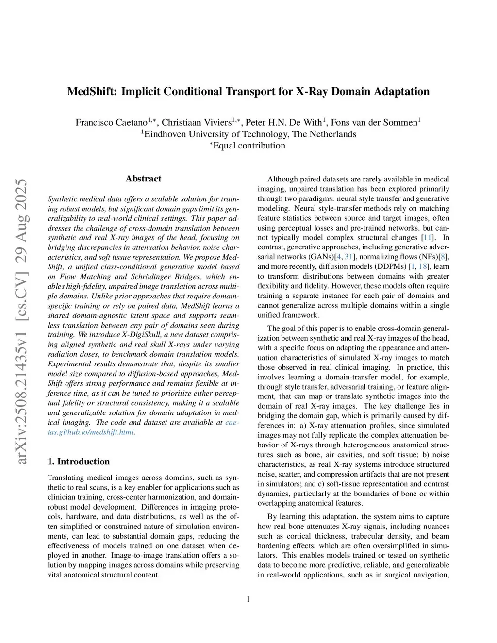 Synthetic medical data offers a scalable solution for training robust models, but significant domain gaps limit its generalizability to real-world clinical settings. This paper addresses the challenge of cross-domain translation between synthetic and real X-ray images of the head, focusing on bridging discrepancies in attenuation behavior, noise characteristics, and soft tissue representation. We propose MedShift, a unified class-conditional generative model based on Flow Matching and Schrodinger Bridges, which enables high-fidelity, unpaired image translation across multiple domains. Unlike prior approaches that require domain-specific training or rely on paired data, MedShift learns a shared domain-agnostic latent space and supports seamless translation between any pair of domains seen during training. We introduce X-DigiSkull, a new dataset comprising aligned synthetic and real skull X-rays under varying radiation doses, to benchmark domain translation models. Experimental results demonstrate that, despite its smaller model size compared to diffusion-based approaches, MedShift offers strong performance and remains flexible at inference time, as it can be tuned to prioritize either perceptual fidelity or structural consistency, making it a scalable and generalizable solution for domain adaptation in medical imaging. The code and dataset are available atthis https URL