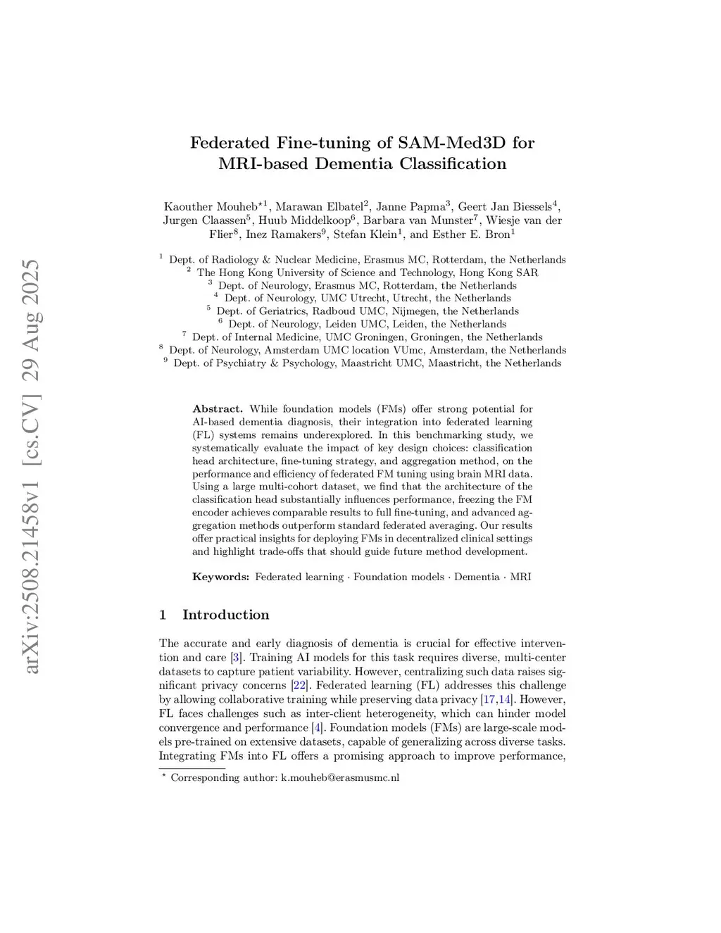 Federated Fine-tuning of SAM-Med3D for MRI-based Dementia Classification