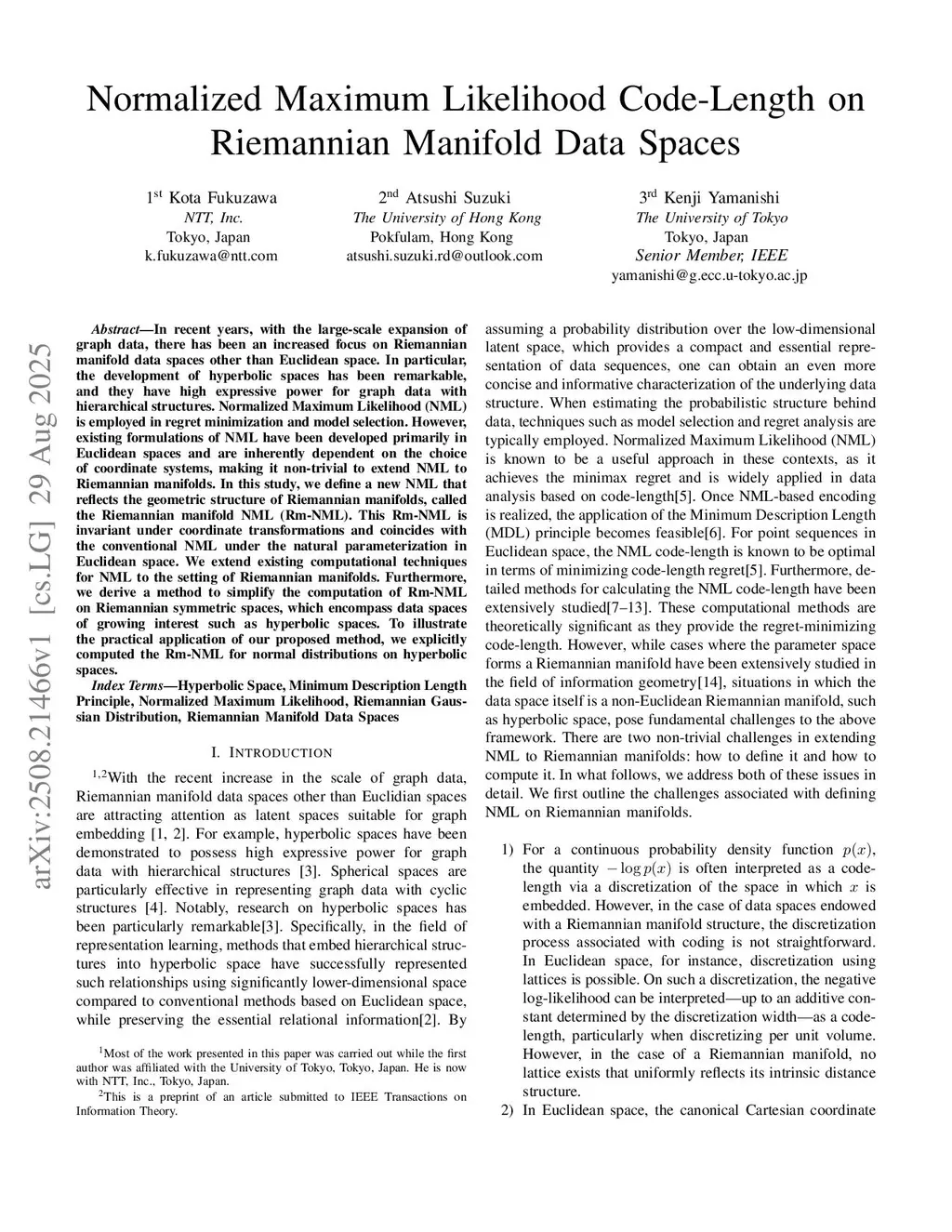 Normalized Maximum Likelihood Code-Length on Riemannian Manifold Data Spaces