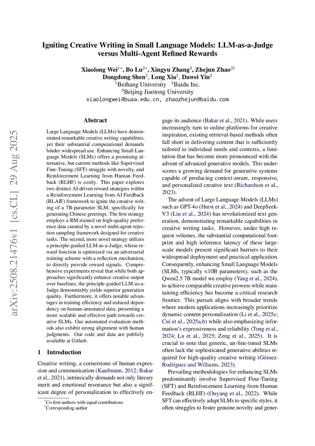 Large Language Models (LLMs) have demonstrated remarkable creative writing capabilities, yet their substantial computational demands hinder widespread use. Enhancing Small Language Models (SLMs) offers a promising alternative, but current methods like Supervised Fine-Tuning (SFT) struggle with novelty, and Reinforcement Learning from Human Feedback (RLHF) is costly. This paper explores two distinct AI-driven reward strategies within a Reinforcement Learning from AI Feedback (RLAIF) framework to ignite the creative writing of a 7B-parameter SLM, specifically for generating Chinese greetings. The first strategy employs a RM trained on high-quality preference data curated by a novel multi-agent rejection sampling framework designed for creative tasks. The second, more novel strategy utilizes a principle-guided LLM-as-a-Judge, whose reward function is optimized via an adversarial training scheme with a reflection mechanism, to directly provide reward signals. Comprehensive experiments reveal that while both approaches significantly enhance creative output over baselines, the principle-guided LLM-as-a-Judge demonstrably yields superior generation quality. Furthermore, it offers notable advantages in training efficiency and reduced dependency on human-annotated data, presenting a more scalable and effective path towards creative SLMs. Our automated evaluation methods also exhibit strong alignment with human judgments. Our code and data are publicly available atthis https URL.