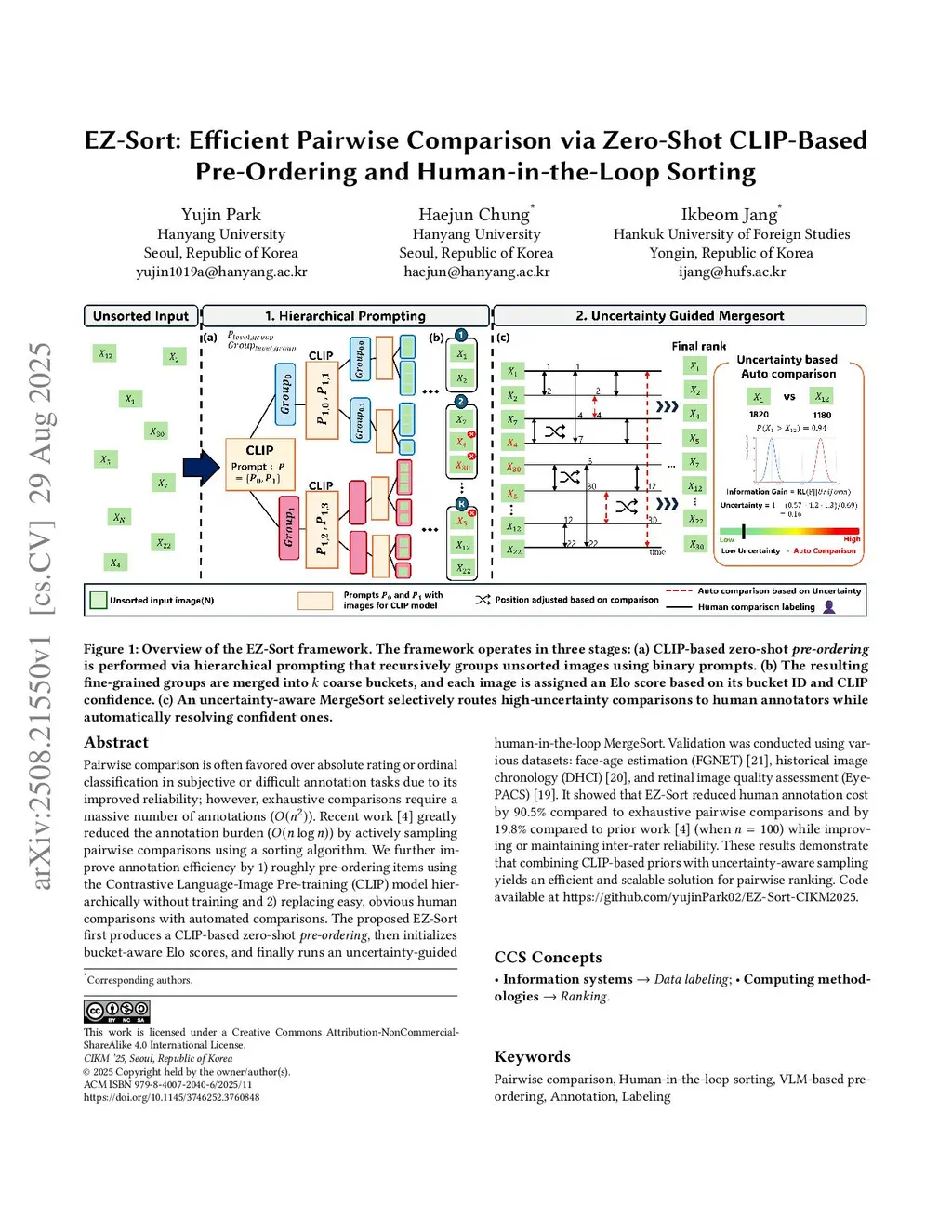 Pairwise comparison is often favored over absolute rating or ordinal classification in subjective or difficult annotation tasks due to its improved reliability. However, exhaustive comparisons require a massive number of annotations (O(n^2)). Recent work has greatly reduced the annotation burden (O(n log n)) by actively sampling pairwise comparisons using a sorting algorithm. We further improve annotation efficiency by (1) roughly pre-ordering items using the Contrastive Language-Image Pre-training (CLIP) model hierarchically without training, and (2) replacing easy, obvious human comparisons with automated comparisons. The proposed EZ-Sort first produces a CLIP-based zero-shot pre-ordering, then initializes bucket-aware Elo scores, and finally runs an uncertainty-guided human-in-the-loop MergeSort. Validation was conducted using various datasets: face-age estimation (FGNET), historical image chronology (DHCI), and retinal image quality assessment (EyePACS). It showed that EZ-Sort reduced human annotation cost by 90.5% compared to exhaustive pairwise comparisons and by 19.8% compared to prior work (when n = 100), while improving or maintaining inter-rater reliability. These results demonstrate that combining CLIP-based priors with uncertainty-aware sampling yields an efficient and scalable solution for pairwise ranking.