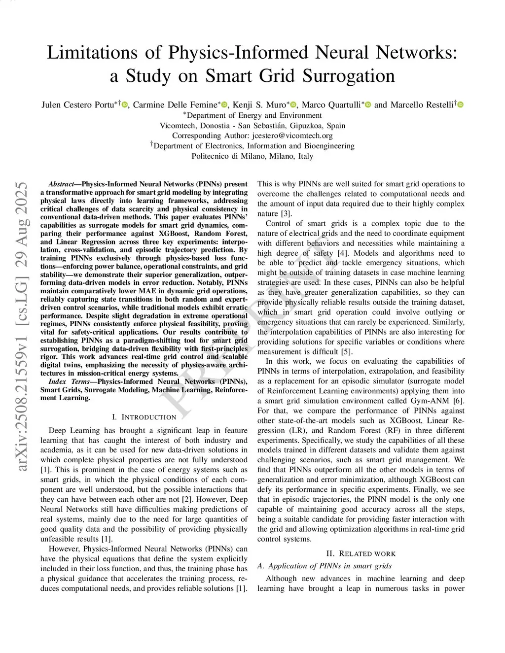Physics-Informed Neural Networks (PINNs) present a transformative approach for smart grid modeling by integrating physical laws directly into learning frameworks, addressing critical challenges of data scarcity and physical consistency in conventional data-driven methods. This paper evaluates PINNs' capabilities as surrogate models for smart grid dynamics, comparing their performance against XGBoost, Random Forest, and Linear Regression across three key experiments: interpolation, cross-validation, and episodic trajectory prediction. By training PINNs exclusively through physics-based loss functions (enforcing power balance, operational constraints, and grid stability) we demonstrate their superior generalization, outperforming data-driven models in error reduction. Notably, PINNs maintain comparatively lower MAE in dynamic grid operations, reliably capturing state transitions in both random and expert-driven control scenarios, while traditional models exhibit erratic performance. Despite slight degradation in extreme operational regimes, PINNs consistently enforce physical feasibility, proving vital for safety-critical applications. Our results contribute to establishing PINNs as a paradigm-shifting tool for smart grid surrogation, bridging data-driven flexibility with first-principles rigor. This work advances real-time grid control and scalable digital twins, emphasizing the necessity of physics-aware architectures in mission-critical energy systems.