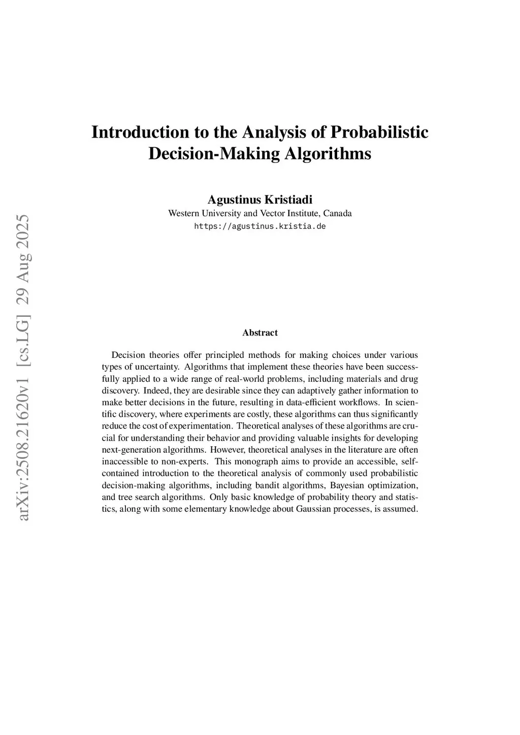 Decision theories offer principled methods for making choices under various types of uncertainty. Algorithms that implement these theories have been successfully applied to a wide range of real-world problems, including materials and drug discovery. Indeed, they are desirable since they can adaptively gather information to make better decisions in the future, resulting in data-efficient workflows. In scientific discovery, where experiments are costly, these algorithms can thus significantly reduce the cost of experimentation. Theoretical analyses of these algorithms are crucial for understanding their behavior and providing valuable insights for developing next-generation algorithms. However, theoretical analyses in the literature are often inaccessible to non-experts. This monograph aims to provide an accessible, self-contained introduction to the theoretical analysis of commonly used probabilistic decision-making algorithms, including bandit algorithms, Bayesian optimization, and tree search algorithms. Only basic knowledge of probability theory and statistics, along with some elementary knowledge about Gaussian processes, is assumed.