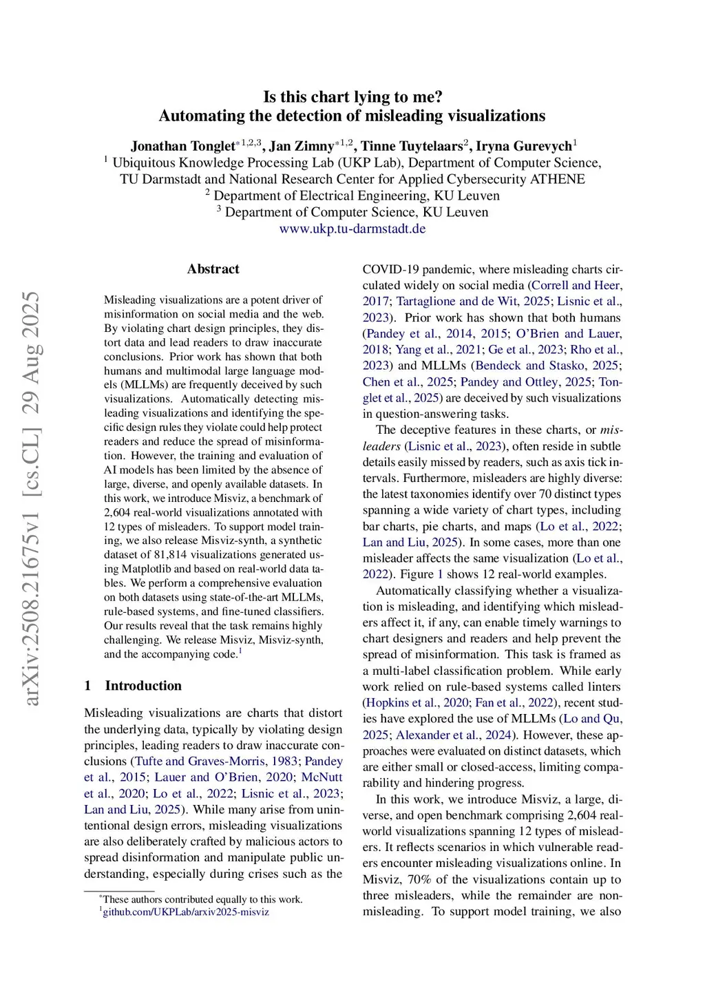 Misleading visualizations are a potent driver of misinformation on social media and the web. By violating chart design principles, they distort data and lead readers to draw inaccurate conclusions. Prior work has shown that both humans and multimodal large language models (MLLMs) are frequently deceived by such visualizations. Automatically detecting misleading visualizations and identifying the specific design rules they violate could help protect readers and reduce the spread of misinformation. However, the training and evaluation of AI models has been limited by the absence of large, diverse, and openly available datasets. In this work, we introduce Misviz, a benchmark of 2,604 real-world visualizations annotated with 12 types of misleaders. To support model training, we also create Misviz-synth, a synthetic dataset of 57,665 visualizations generated using Matplotlib and based on real-world data tables. We perform a comprehensive evaluation on both datasets using state-of-the-art MLLMs, rule-based systems, and image-axis classifiers. Our results reveal that the task remains highly challenging. We release Misviz, Misviz-synth, and the accompanying code.