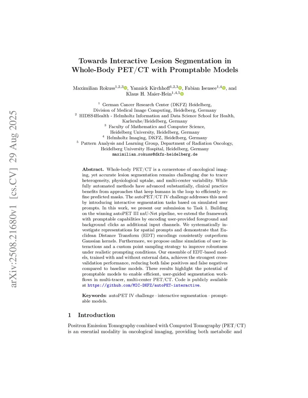 Whole-body PET/CT is a cornerstone of oncological imaging, yet accurate lesion segmentation remains challenging due to tracer heterogeneity, physiological uptake, and multi-center variability. While fully automated methods have advanced substantially, clinical practice benefits from approaches that keep humans in the loop to efficiently refine predicted masks. The autoPET/CT IV challenge addresses this need by introducing interactive segmentation tasks based on simulated user prompts. In this work, we present our submission to Task 1. Building on the winning autoPET III nnU-Net pipeline, we extend the framework with promptable capabilities by encoding user-provided foreground and background clicks as additional input channels. We systematically investigate representations for spatial prompts and demonstrate that Euclidean Distance Transform (EDT) encodings consistently outperform Gaussian kernels. Furthermore, we propose online simulation of user interactions and a custom point sampling strategy to improve robustness under realistic prompting conditions. Our ensemble of EDT-based models, trained with and without external data, achieves the strongest cross-validation performance, reducing both false positives and false negatives compared to baseline models. These results highlight the potential of promptable models to enable efficient, user-guided segmentation workflows in multi-tracer, multi-center PET/CT. Code is publicly available atthis https URL