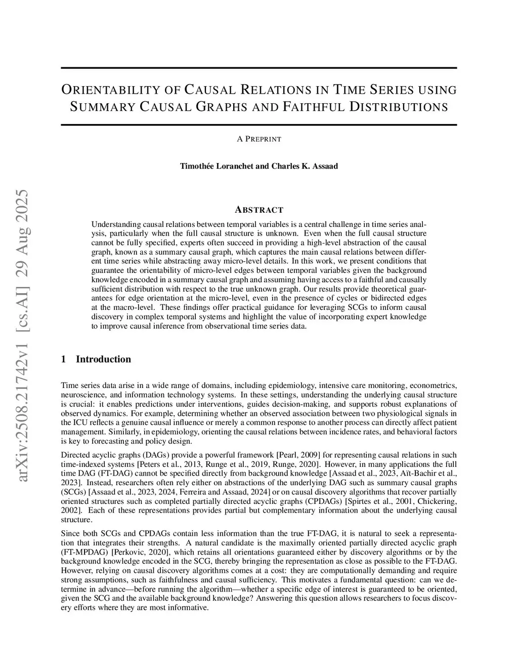Orientability of Causal Relations in Time Series using Summary Causal Graphs and Faithful Distributions