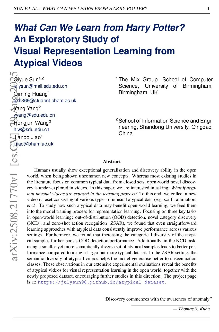 What Can We Learn from Harry Potter? An Exploratory Study of Visual Representation Learning from Atypical Videos