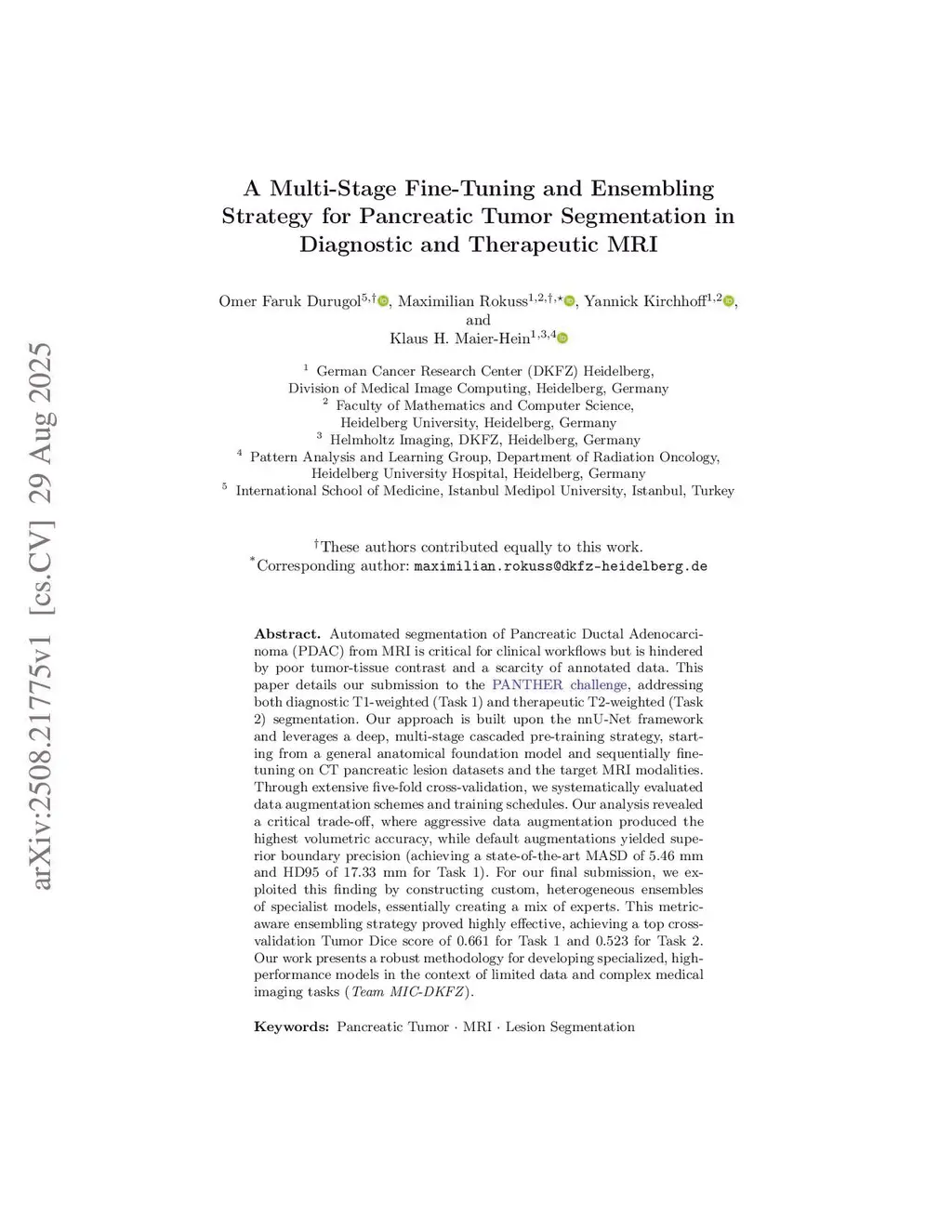 Automated segmentation of Pancreatic Ductal Adenocarcinoma (PDAC) from MRI is critical for clinical workflows but is hindered by poor tumor-tissue contrast and a scarcity of annotated data. This paper details our submission to the PANTHER challenge, addressing both diagnostic T1-weighted (Task 1) and therapeutic T2-weighted (Task 2) segmentation. Our approach is built upon the nnU-Net framework and leverages a deep, multi-stage cascaded pre-training strategy, starting from a general anatomical foundation model and sequentially fine-tuning on CT pancreatic lesion datasets and the target MRI modalities. Through extensive five-fold cross-validation, we systematically evaluated data augmentation schemes and training schedules. Our analysis revealed a critical trade-off, where aggressive data augmentation produced the highest volumetric accuracy, while default augmentations yielded superior boundary precision (achieving a state-of-the-art MASD of 5.46 mm and HD95 of 17.33 mm for Task 1). For our final submission, we exploited this finding by constructing custom, heterogeneous ensembles of specialist models, essentially creating a mix of experts. This metric-aware ensembling strategy proved highly effective, achieving a top cross-validation Tumor Dice score of 0.661 for Task 1 and 0.523 for Task 2. Our work presents a robust methodology for developing specialized, high-performance models in the context of limited data and complex medical imaging tasks (Team MIC-DKFZ).