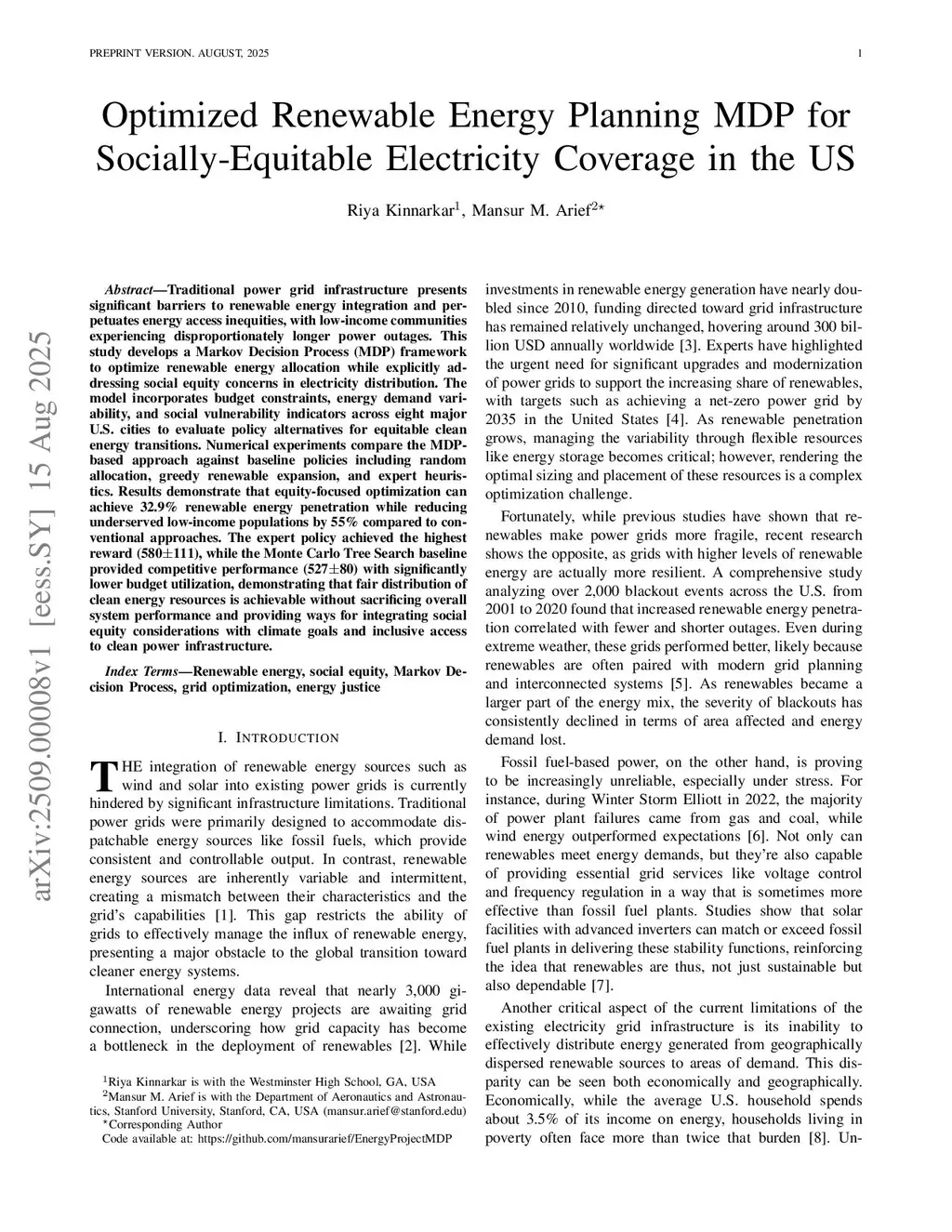 Optimized Renewable Energy Planning MDP for Socially-Equitable Electricity Coverage in the US