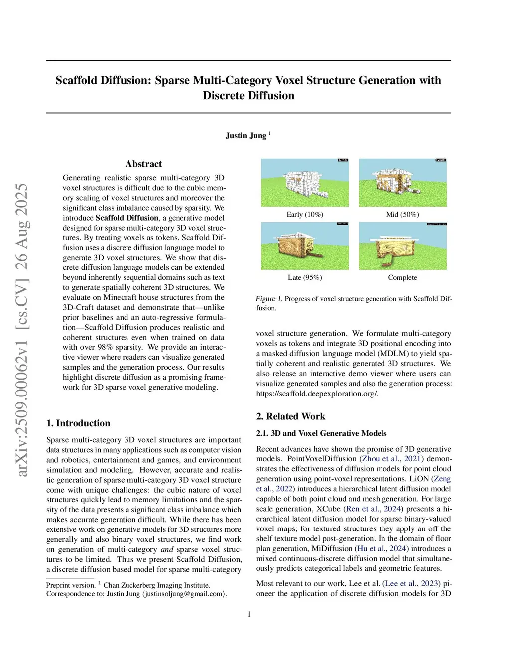 Generating realistic sparse multi-category 3D voxel structures is difficult due to the cubic memory scaling of voxel structures and moreover the significant class imbalance caused by sparsity. We introduce Scaffold Diffusion, a generative model designed for sparse multi-category 3D voxel structures. By treating voxels as tokens, Scaffold Diffusion uses a discrete diffusion language model to generate 3D voxel structures. We show that discrete diffusion language models can be extended beyond inherently sequential domains such as text to generate spatially coherent 3D structures. We evaluate on Minecraft house structures from the 3D-Craft dataset and demonstrate that, unlike prior baselines and an auto-regressive formulation, Scaffold Diffusion produces realistic and coherent structures even when trained on data with over 98% sparsity. We provide an interactive viewer where readers can visualize generated samples and the generation process:this https URL