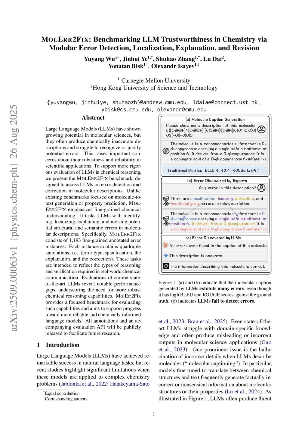 Large Language Models (LLMs) have shown growing potential in molecular sciences, but they often produce chemically inaccurate descriptions and struggle to recognize or justify potential errors. This raises important concerns about their robustness and reliability in scientific applications. To support more rigorous evaluation of LLMs in chemical reasoning, we present the MolErr2Fix benchmark, designed to assess LLMs on error detection and correction in molecular descriptions. Unlike existing benchmarks focused on molecule-to-text generation or property prediction, MolErr2Fix emphasizes fine-grained chemical understanding. It tasks LLMs with identifying, localizing, explaining, and revising potential structural and semantic errors in molecular descriptions. Specifically, MolErr2Fix consists of 1,193 fine-grained annotated error instances. Each instance contains quadruple annotations, i.e,. (error type, span location, the explanation, and the correction). These tasks are intended to reflect the types of reasoning and verification required in real-world chemical communication. Evaluations of current state-of-the-art LLMs reveal notable performance gaps, underscoring the need for more robust chemical reasoning capabilities. MolErr2Fix provides a focused benchmark for evaluating such capabilities and aims to support progress toward more reliable and chemically informed language models. All annotations and an accompanying evaluation API will be publicly released to facilitate future research.