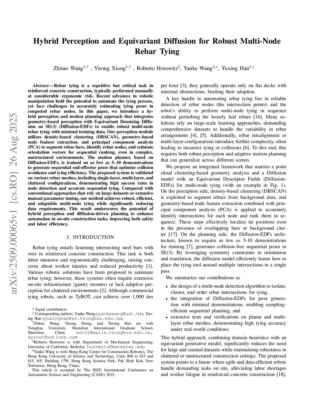 Hybrid Perception and Equivariant Diffusion for Robust Multi-Node Rebar Tying