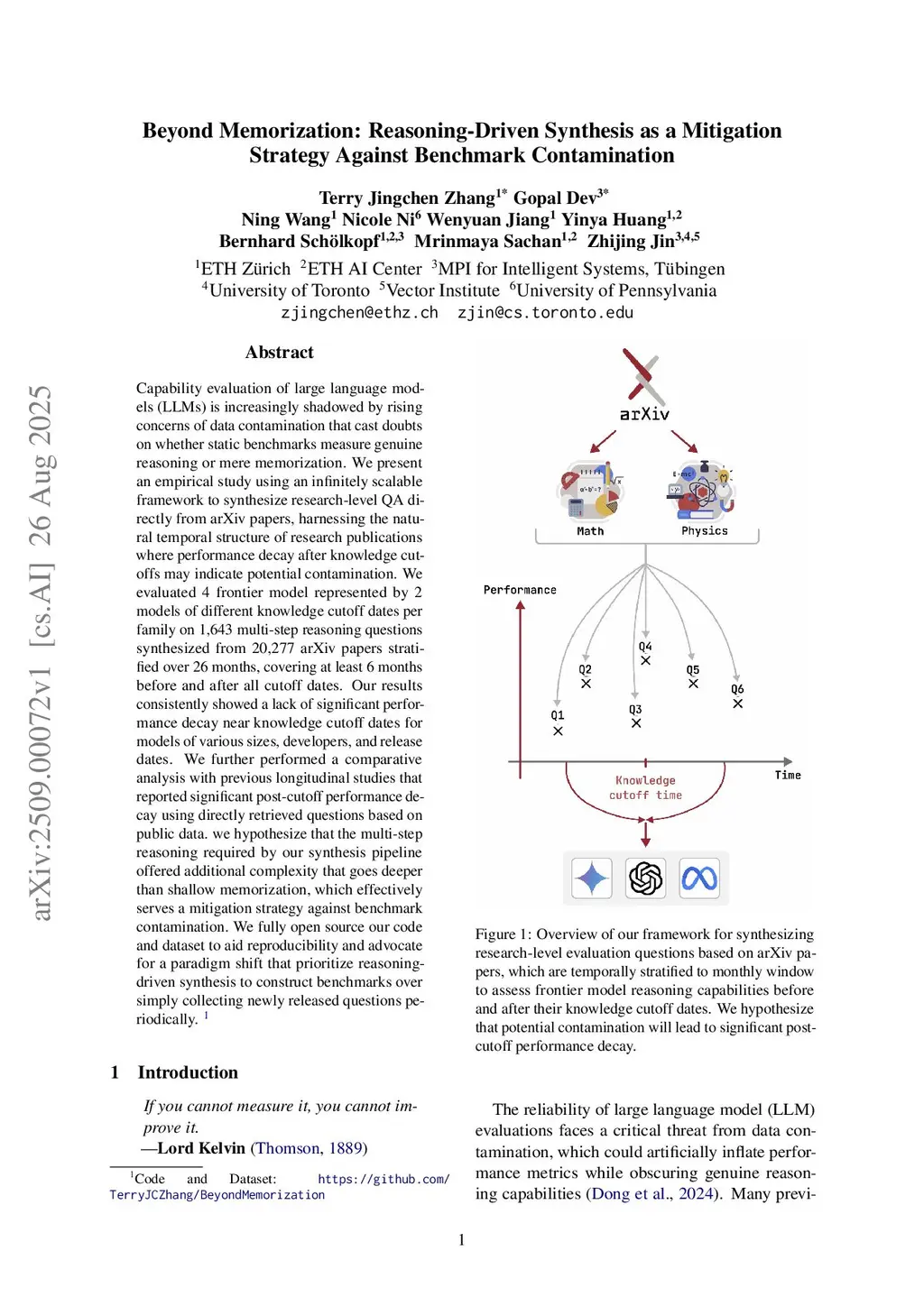 Capability evaluation of large language models (LLMs) is increasingly shadowed by rising concerns of data contamination that cast doubts on whether static benchmarks measure genuine reasoning or mere memorization. We present an empirical study using an infinitely scalable framework to synthesize research-level QA directly from arXiv papers, harnessing the natural temporal structure of research publications where performance decay after knowledge cutoffs may indicate potential contamination. We evaluated 4 frontier model represented by 2 models of different knowledge cutoff dates per family on 1,643 multi-step reasoning questions synthesized from 20,277 arXiv papers stratified over 26 months, covering at least 6 months before and after all cutoff dates. Our results consistently showed a lack of significant performance decay near knowledge cutoff dates for models of various sizes, developers, and release dates. We further performed a comparative analysis with previous longitudinal studies that reported significant post-cutoff performance decay using directly retrieved questions based on public data. we hypothesize that the multi-step reasoning required by our synthesis pipeline offered additional complexity that goes deeper than shallow memorization, which effectively serves a mitigation strategy against benchmark contamination. We fully open source our code and dataset to aid reproducibility and advocate for a paradigm shift that prioritize reasoning-driven synthesis to construct benchmarks over simply collecting newly released questions periodically.