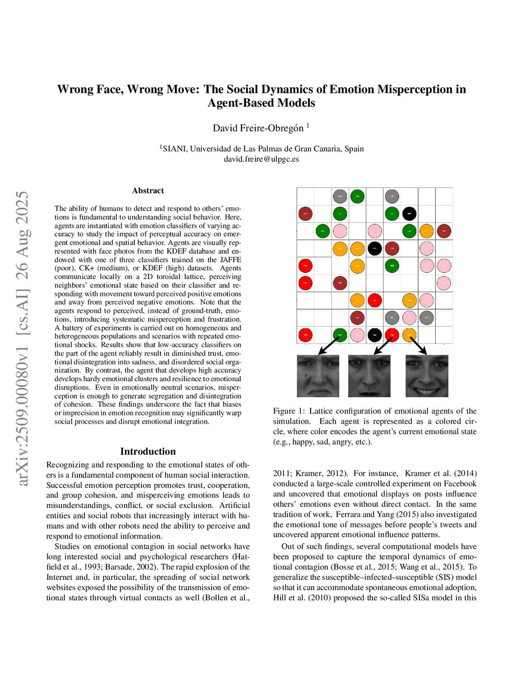 The ability of humans to detect and respond to others' emotions is fundamental to understanding social behavior. Here, agents are instantiated with emotion classifiers of varying accuracy to study the impact of perceptual accuracy on emergent emotional and spatial behavior. Agents are visually represented with face photos from the KDEF database and endowed with one of three classifiers trained on the JAFFE (poor), CK+ (medium), or KDEF (high) datasets. Agents communicate locally on a 2D toroidal lattice, perceiving neighbors' emotional state based on their classifier and responding with movement toward perceived positive emotions and away from perceived negative emotions. Note that the agents respond to perceived, instead of ground-truth, emotions, introducing systematic misperception and frustration. A battery of experiments is carried out on homogeneous and heterogeneous populations and scenarios with repeated emotional shocks. Results show that low-accuracy classifiers on the part of the agent reliably result in diminished trust, emotional disintegration into sadness, and disordered social organization. By contrast, the agent that develops high accuracy develops hardy emotional clusters and resilience to emotional disruptions. Even in emotionally neutral scenarios, misperception is enough to generate segregation and disintegration of cohesion. These findings underscore the fact that biases or imprecision in emotion recognition may significantly warp social processes and disrupt emotional integration.