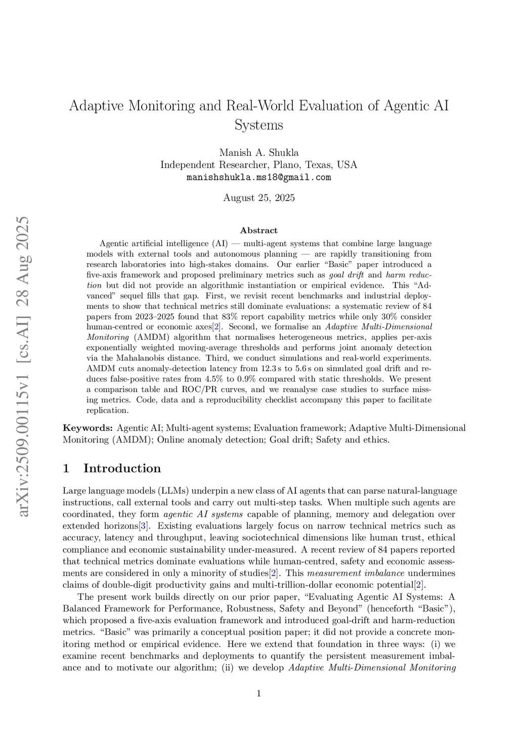 Agentic artificial intelligence (AI) -- multi-agent systems that combine large language models with external tools and autonomous planning -- are rapidly transitioning from research laboratories into high-stakes domains. Our earlier "Basic" paper introduced a five-axis framework and proposed preliminary metrics such as goal drift and harm reduction but did not provide an algorithmic instantiation or empirical evidence. This "Advanced" sequel fills that gap. First, we revisit recent benchmarks and industrial deployments to show that technical metrics still dominate evaluations: a systematic review of 84 papers from 2023--2025 found that 83% report capability metrics while only 30% consider human-centred or economic axes [2]. Second, we formalise an Adaptive Multi-Dimensional Monitoring (AMDM) algorithm that normalises heterogeneous metrics, applies per-axis exponentially weighted moving-average thresholds and performs joint anomaly detection via the Mahalanobis distance [7]. Third, we conduct simulations and real-world experiments. AMDM cuts anomaly-detection latency from 12.3 s to 5.6 s on simulated goal drift and reduces false-positive rates from 4.5% to 0.9% compared with static thresholds. We present a comparison table and ROC/PR curves, and we reanalyse case studies to surface missing metrics. Code, data and a reproducibility checklist accompany this paper to facilitate replication. The code supporting this work is available atthis https URL.
