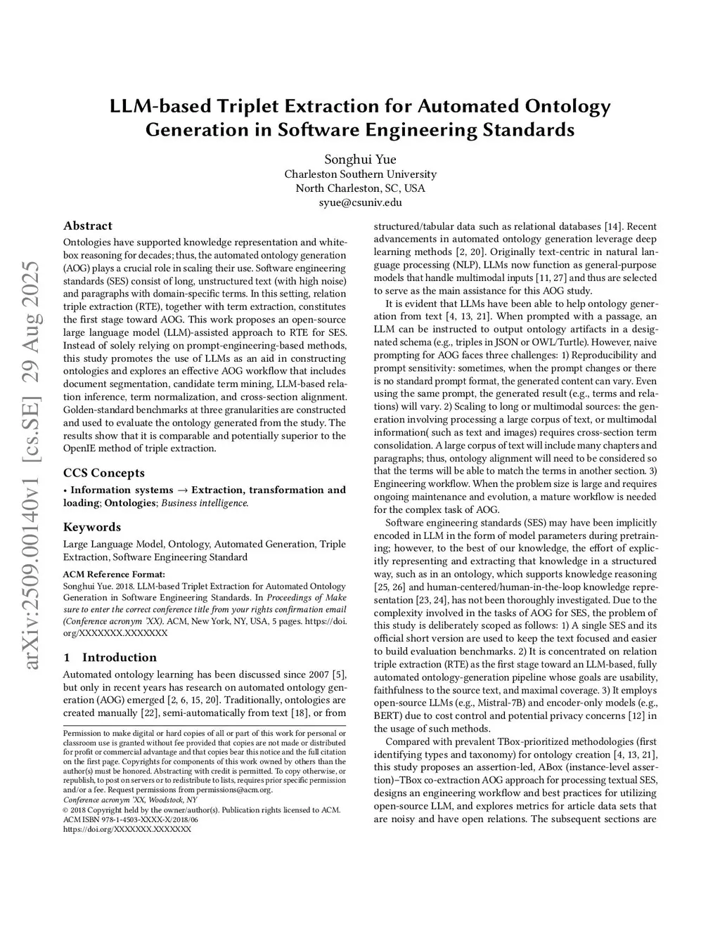 Ontologies have supported knowledge representation and white-box reasoning for decades; thus, the automated ontology generation (AOG) plays a crucial role in scaling their use. Software engineering standards (SES) consist of long, unstructured text (with high noise) and paragraphs with domain-specific terms. In this setting, relation triple extraction (RTE), together with term extraction, constitutes the first stage toward AOG. This work proposes an open-source large language model (LLM)-assisted approach to RTE for SES. Instead of solely relying on prompt-engineering-based methods, this study promotes the use of LLMs as an aid in constructing ontologies and explores an effective AOG workflow that includes document segmentation, candidate term mining, LLM-based relation inference, term normalization, and cross-section alignment. Expert-annotated reference sets at three granularities are constructed and used to evaluate the ontology generated from the study. The results show that it is comparable and potentially superior to the OpenIE method of triple extraction.