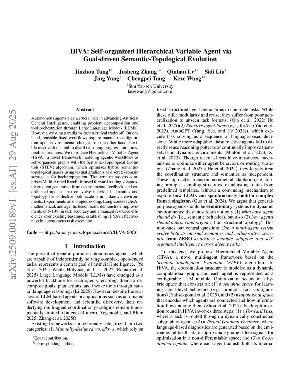 HiVA: Self-organized Hierarchical Variable Agent via Goal-driven Semantic-Topological Evolution