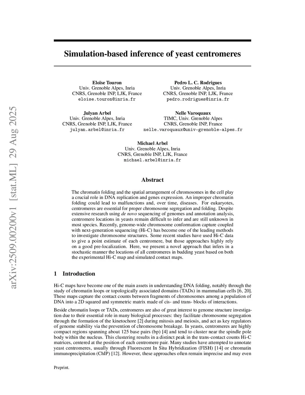 The chromatin folding and the spatial arrangement of chromosomes in the cell play a crucial role in DNA replication and genes expression. An improper chromatin folding could lead to malfunctions and, over time, diseases. For eukaryotes, centromeres are essential for proper chromosome segregation and folding. Despite extensive research using de novo sequencing of genomes and annotation analysis, centromere locations in yeasts remain difficult to infer and are still unknown in most species. Recently, genome-wide chromosome conformation capture coupled with next-generation sequencing (Hi-C) has become one of the leading methods to investigate chromosome structures. Some recent studies have used Hi-C data to give a point estimate of each centromere, but those approaches highly rely on a good pre-localization. Here, we present a novel approach that infers in a stochastic manner the locations of all centromeres in budding yeast based on both the experimental Hi-C map and simulated contact maps.