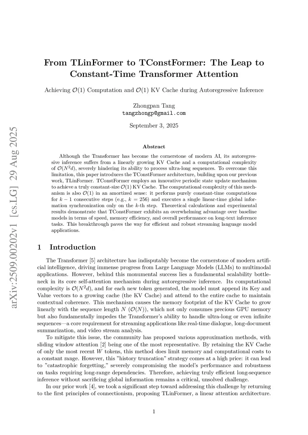 Although the Transformer has become the cornerstone of modern AI, its autoregressive inference suffers from a linearly growing KV Cache and a computational complexity of O(N^2 d), severely hindering its ability to process ultra-long sequences. To overcome this limitation, this paper introduces the TConstFormer architecture, building upon our previous work, TLinFormer. TConstFormer employs an innovative periodic state update mechanism to achieve a truly constant-size O(1) KV Cache. The computational complexity of this mechanism is also O(1) in an amortized sense: it performs purely constant-time computations for consecutive steps (e.g., ) and executes a single linear-time global information synchronization only on the -th step. Theoretical calculations and experimental results demonstrate that TConstFormer exhibits an overwhelming advantage over baseline models in terms of speed, memory efficiency, and overall performance on long-text inference tasks. This breakthrough paves the way for efficient and robust streaming language model applications.