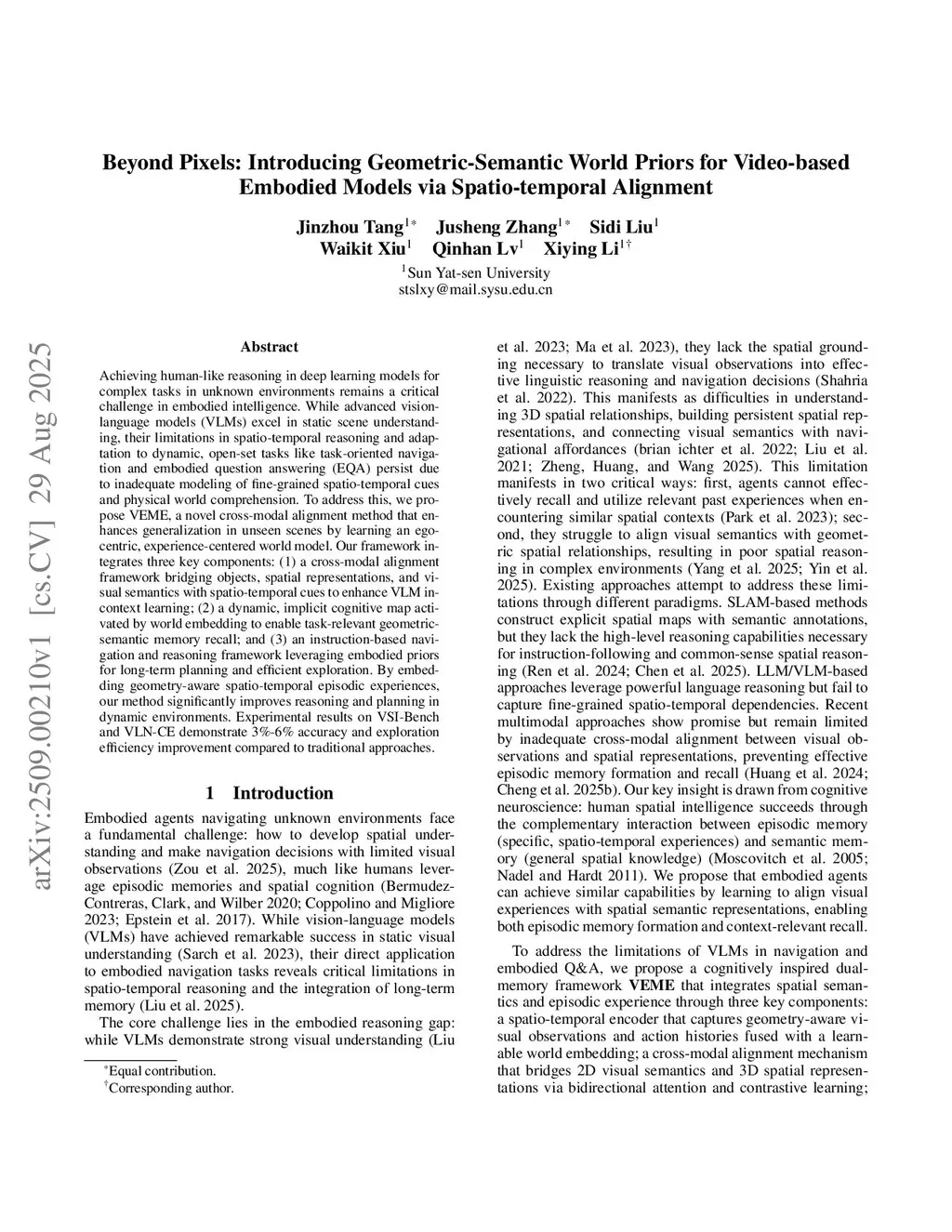 Achieving human-like reasoning in deep learning models for complex tasks in unknown environments remains a critical challenge in embodied intelligence. While advanced vision-language models (VLMs) excel in static scene understanding, their limitations in spatio-temporal reasoning and adaptation to dynamic, open-set tasks like task-oriented navigation and embodied question answering (EQA) persist due to inadequate modeling of fine-grained spatio-temporal cues and physical world comprehension. To address this, we propose VEME, a novel cross-modal alignment method that enhances generalization in unseen scenes by learning an ego-centric, experience-centered world model. Our framework integrates three key components: (1) a cross-modal alignment framework bridging objects, spatial representations, and visual semantics with spatio-temporal cues to enhance VLM in-context learning; (2) a dynamic, implicit cognitive map activated by world embedding to enable task-relevant geometric-semantic memory recall; and (3) an instruction-based navigation and reasoning framework leveraging embodied priors for long-term planning and efficient exploration. By embedding geometry-aware spatio-temporal episodic experiences, our method significantly improves reasoning and planning in dynamic environments. Experimental results on VSI-Bench and VLN-CE demonstrate 1%-3% accuracy and exploration efficiency improvement compared to traditional approaches.