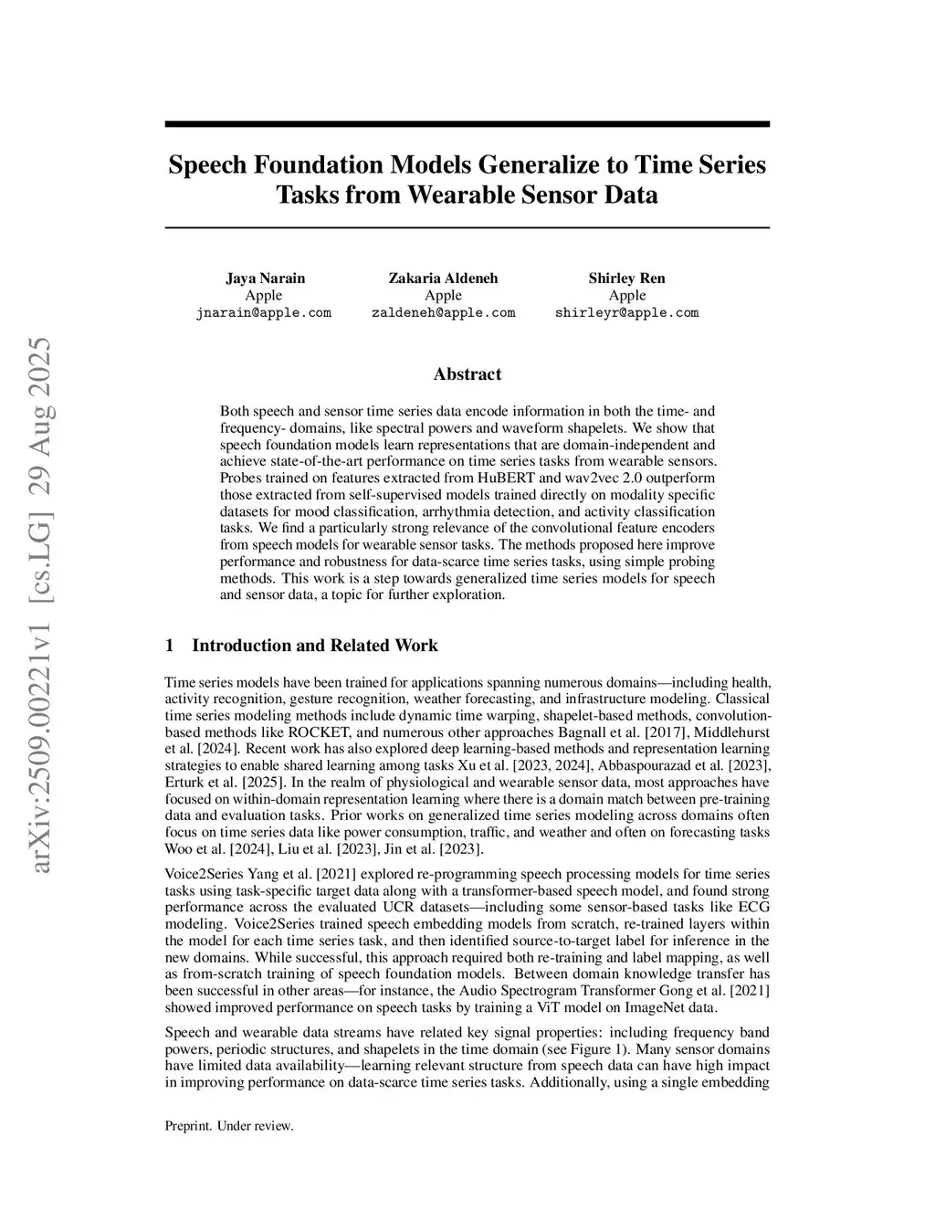 Both speech and sensor time series data encode information in both the time- and frequency- domains, like spectral powers and waveform shapelets. We show that speech foundation models learn representations that generalize beyond the speech domain and achieve state-of-the-art performance on diverse time-series tasks from wearable sensors. Probes trained on features extracted from HuBERT and wav2vec 2.0 outperform those extracted from self-supervised models trained directly on modality-specific datasets for mood classification, arrhythmia detection, and activity classification tasks. We find that the convolutional feature encoders of speech models are particularly relevant for wearable sensor applications. The proposed approach enhances performance on data-scarce time-series tasks using simple probing methods. This work takes a step toward developing generalized time-series models that unify speech and sensor modalities.