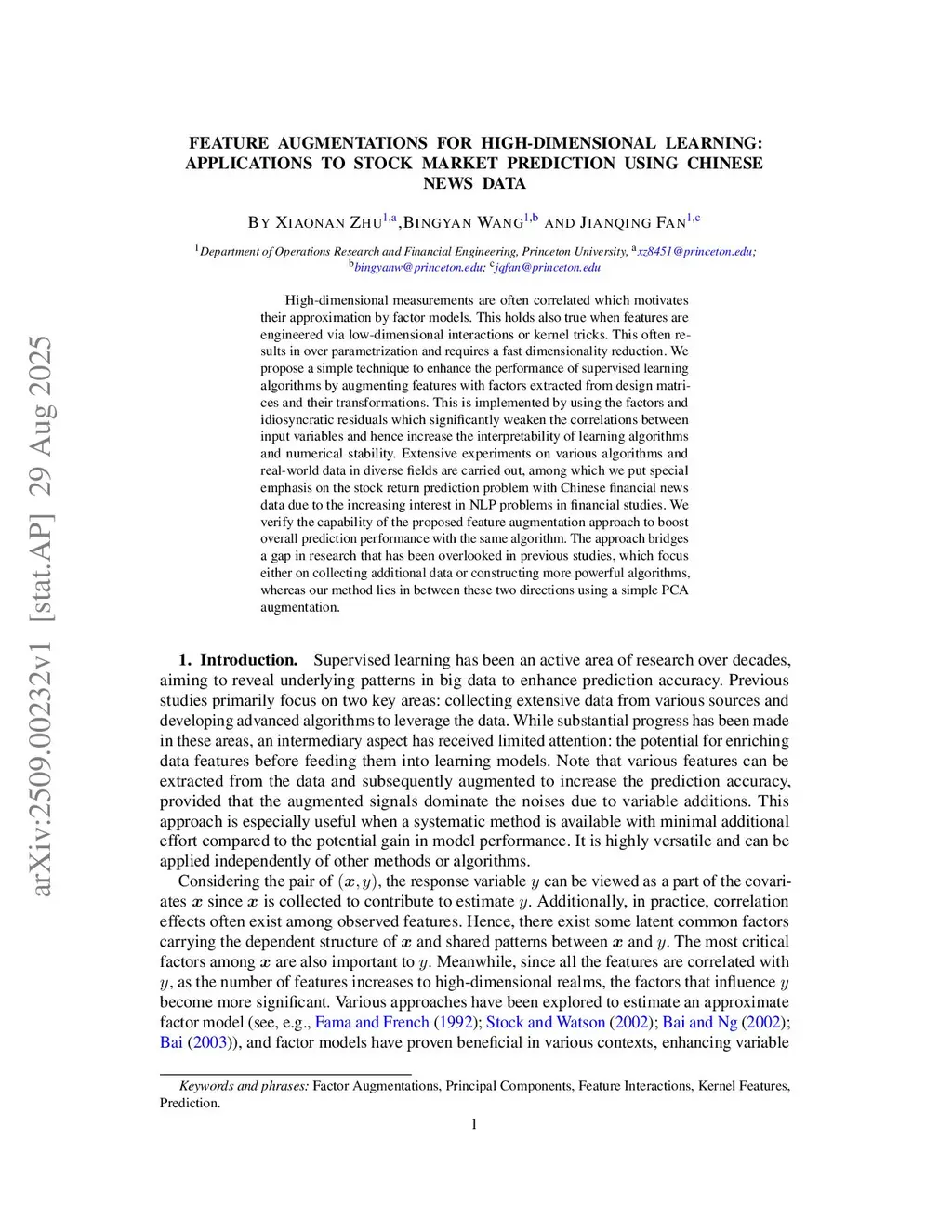High-dimensional measurements are often correlated which motivates their approximation by factor models. This holds also true when features are engineered via low-dimensional interactions or kernel tricks. This often results in over parametrization and requires a fast dimensionality reduction. We propose a simple technique to enhance the performance of supervised learning algorithms by augmenting features with factors extracted from design matrices and their transformations. This is implemented by using the factors and idiosyncratic residuals which significantly weaken the correlations between input variables and hence increase the interpretability of learning algorithms and numerical stability. Extensive experiments on various algorithms and real-world data in diverse fields are carried out, among which we put special emphasis on the stock return prediction problem with Chinese financial news data due to the increasing interest in NLP problems in financial studies. We verify the capability of the proposed feature augmentation approach to boost overall prediction performance with the same algorithm. The approach bridges a gap in research that has been overlooked in previous studies, which focus either on collecting additional data or constructing more powerful algorithms, whereas our method lies in between these two directions using a simple PCA augmentation.