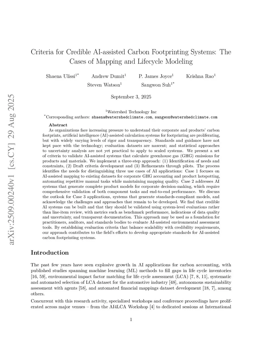 Criteria for Credible AI-assisted Carbon Footprinting Systems: The Cases of Mapping and Lifecycle Modeling