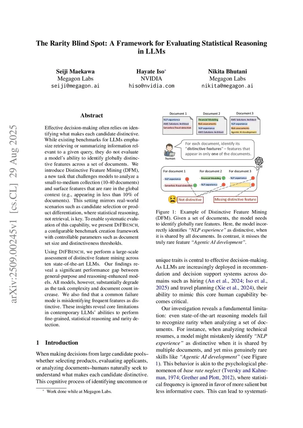Effective decision-making often relies on identifying what makes each candidate distinctive. While existing benchmarks for LLMs emphasize retrieving or summarizing information relevant to a given query, they do not evaluate a model's ability to identify globally distinctive features across a set of documents. We introduce Distinctive Feature Mining (DFM), a new task that challenges models to analyze a small-to-medium collection (10-40 documents) and surface features that are rare in the global context (e.g., appearing in less than 10% of documents). This setting mirrors real-world scenarios such as candidate selection or product differentiation, where statistical reasoning, not retrieval, is key. To enable systematic evaluation of this capability, we present DiFBench, a configurable benchmark creation framework with controllable parameters such as document set size and distinctiveness thresholds. Using DiFBench, we perform a large-scale assessment of distinctive feature mining across ten state-of-the-art LLMs. Our findings reveal a significant performance gap between general-purpose and reasoning-enhanced models. All models, however, substantially degrade as the task complexity and document count increase. We also find that a common failure mode is misidentifying frequent features as distinctive. These insights reveal core limitations in contemporary LLMs' abilities to perform fine-grained, statistical reasoning and rarity detection.