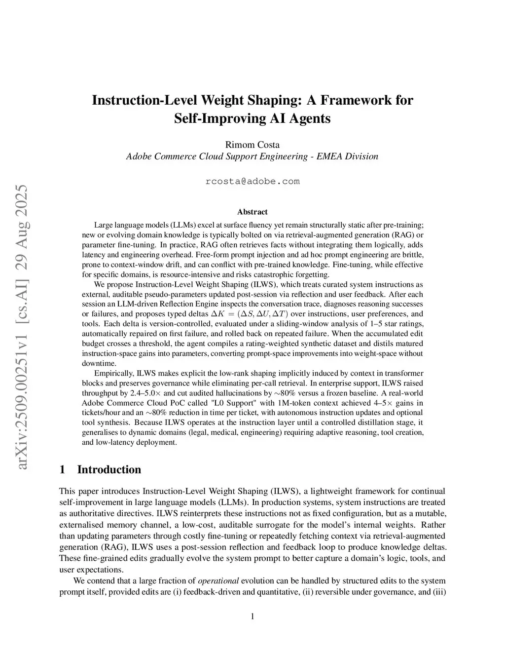 Large language models (LLMs) are fluent but largely static after pre-training; new or shifting knowledge is typically added with retrieval-augmented generation (RAG) or fine-tuning. RAG raises latency and engineering overhead and often fails to integrate facts; prompt engineering is brittle and can conflict with prior knowledge; fine-tuning is costly and risks catastrophic forgetting. We propose Instruction-Level Weight Shaping (ILWS): curated system instructions act as external, auditable pseudo-parameters updated after each session via reflection and user feedback. A Reflection Engine inspects conversation traces, diagnoses reasoning successes and failures, and proposes typed deltas over instructions, user preferences, and tools. Deltas are version-controlled, evaluated with a sliding window of 1-5 star ratings, auto-repaired on first failure, and rolled back on repeated failure. When an edit budget crosses a threshold, the agent compiles a rating-weighted synthetic set and distills matured instruction-space gains into parameters, converting prompt-space improvements into weight-space without downtime. ILWS makes explicit the low-rank shaping induced by context in transformer blocks, preserves governance, and removes per-call retrieval. In enterprise support it increased throughput 2.4-5.0x and cut audited hallucinations by about 80% versus a frozen baseline. In an Adobe Commerce Cloud proof of concept "L0 Support", it achieved 4-5x more tickets per hour and about 80% lower time per ticket, with autonomous instruction updates and optional tool synthesis. Because ILWS operates at the instruction layer until controlled distillation, it generalizes to dynamic domains (legal, medical, engineering) requiring adaptive reasoning, tool creation, and low-latency deployment.