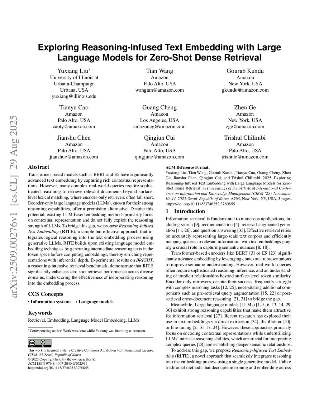 Exploring Reasoning-Infused Text Embedding with Large Language Models for Zero-Shot Dense Retrieval