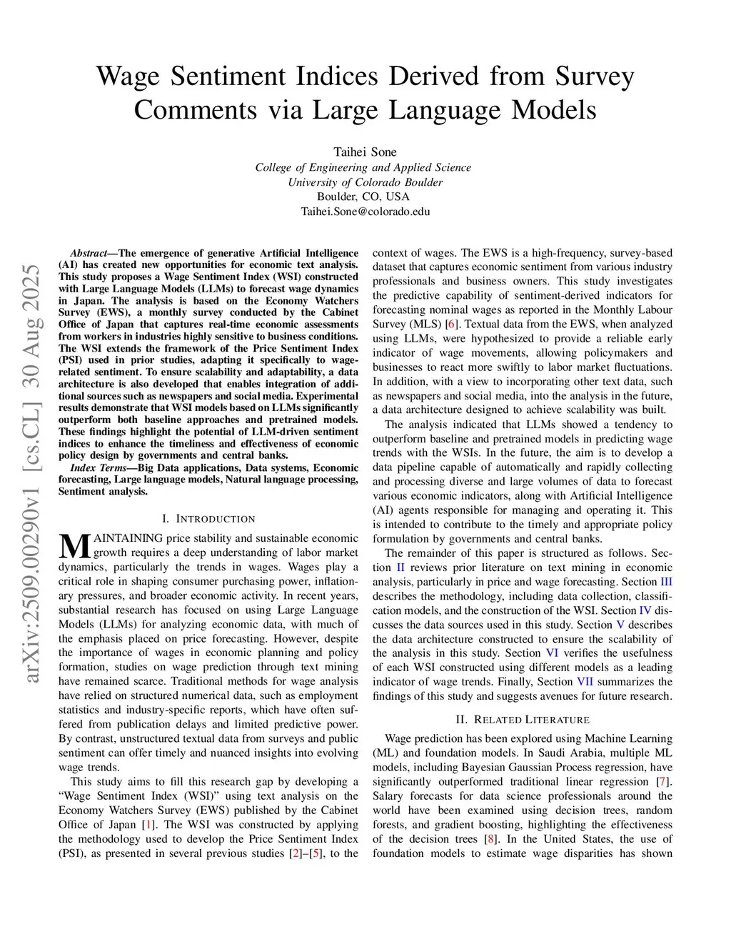 The emergence of generative Artificial Intelligence (AI) has created new opportunities for economic text analysis. This study proposes a Wage Sentiment Index (WSI) constructed with Large Language Models (LLMs) to forecast wage dynamics in Japan. The analysis is based on the Economy Watchers Survey (EWS), a monthly survey conducted by the Cabinet Office of Japan that captures real-time economic assessments from workers in industries highly sensitive to business conditions. The WSI extends the framework of the Price Sentiment Index (PSI) used in prior studies, adapting it specifically to wage related sentiment. To ensure scalability and adaptability, a data architecture is also developed that enables integration of additional sources such as newspapers and social media. Experimental results demonstrate that WSI models based on LLMs significantly outperform both baseline approaches and pretrained models. These findings highlight the potential of LLM-driven sentiment indices to enhance the timeliness and effectiveness of economic policy design by governments and central banks.