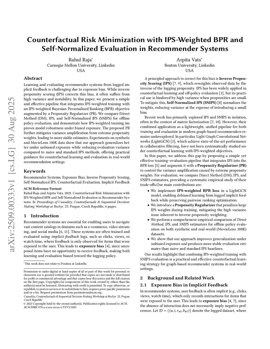 Learning and evaluating recommender systems from logged implicit feedback is challenging due to exposure bias. While inverse propensity scoring (IPS) corrects this bias, it often suffers from high variance and instability. In this paper, we present a simple and effective pipeline that integrates IPS-weighted training with an IPS-weighted Bayesian Personalized Ranking (BPR) objective augmented by a Propensity Regularizer (PR). We compare Direct Method (DM), IPS, and Self-Normalized IPS (SNIPS) for offline policy evaluation, and demonstrate how IPS-weighted training improves model robustness under biased exposure. The proposed PR further mitigates variance amplification from extreme propensity weights, leading to more stable estimates. Experiments on synthetic and MovieLens 100K data show that our approach generalizes better under unbiased exposure while reducing evaluation variance compared to naive and standard IPS methods, offering practical guidance for counterfactual learning and evaluation in real-world recommendation settings.