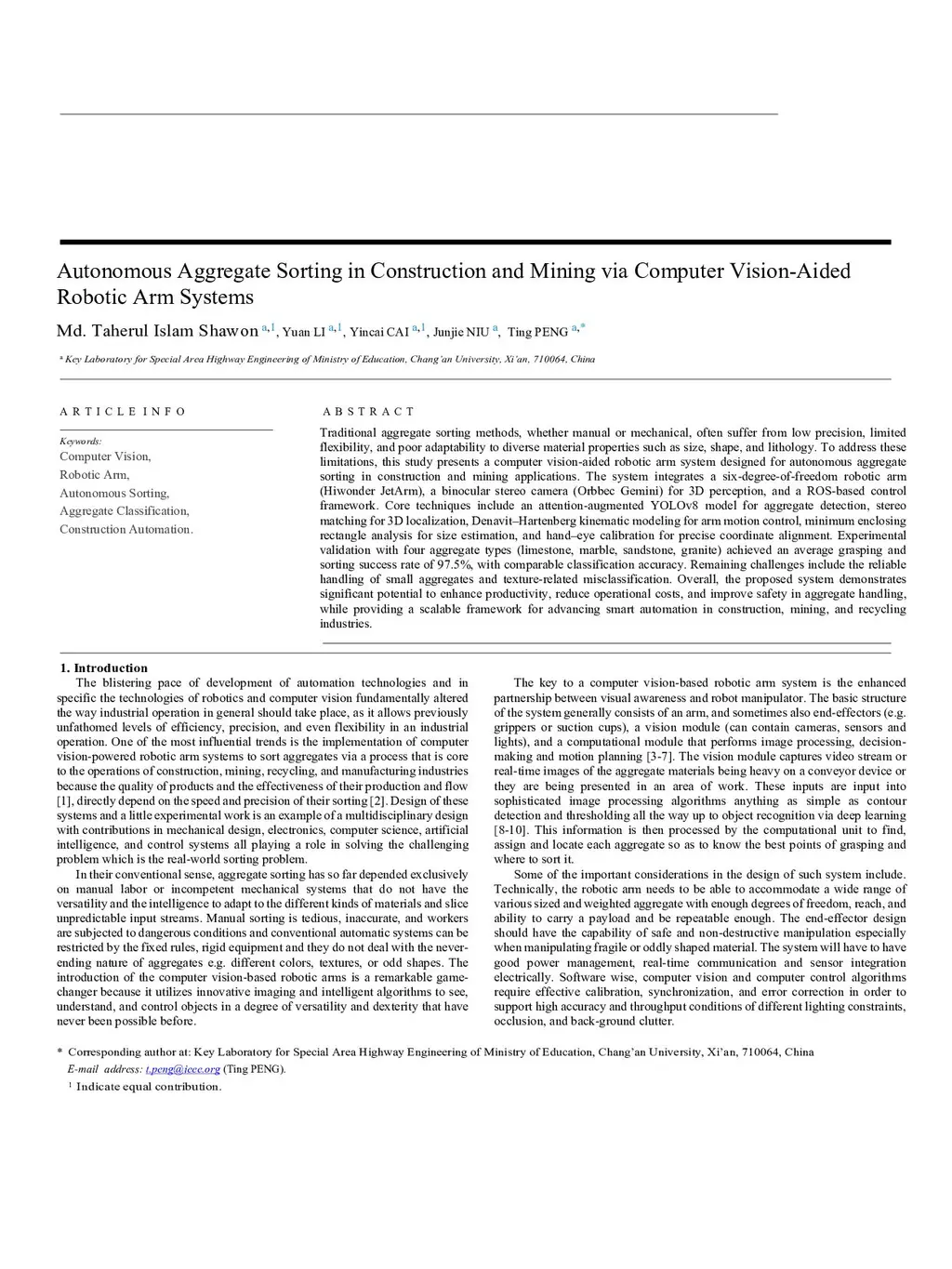 Traditional aggregate sorting methods, whether manual or mechanical, often suffer from low precision, limited flexibility, and poor adaptability to diverse material properties such as size, shape, and lithology. To address these limitations, this study presents a computer vision-aided robotic arm system designed for autonomous aggregate sorting in construction and mining applications. The system integrates a six-degree-of-freedom robotic arm, a binocular stereo camera for 3D perception, and a ROS-based control framework. Core techniques include an attention-augmented YOLOv8 model for aggregate detection, stereo matching for 3D localization, Denavit-Hartenberg kinematic modeling for arm motion control, minimum enclosing rectangle analysis for size estimation, and hand-eye calibration for precise coordinate alignment. Experimental validation with four aggregate types achieved an average grasping and sorting success rate of 97.5%, with comparable classification accuracy. Remaining challenges include the reliable handling of small aggregates and texture-based misclassification. Overall, the proposed system demonstrates significant potential to enhance productivity, reduce operational costs, and improve safety in aggregate handling, while providing a scalable framework for advancing smart automation in construction, mining, and recycling industries.