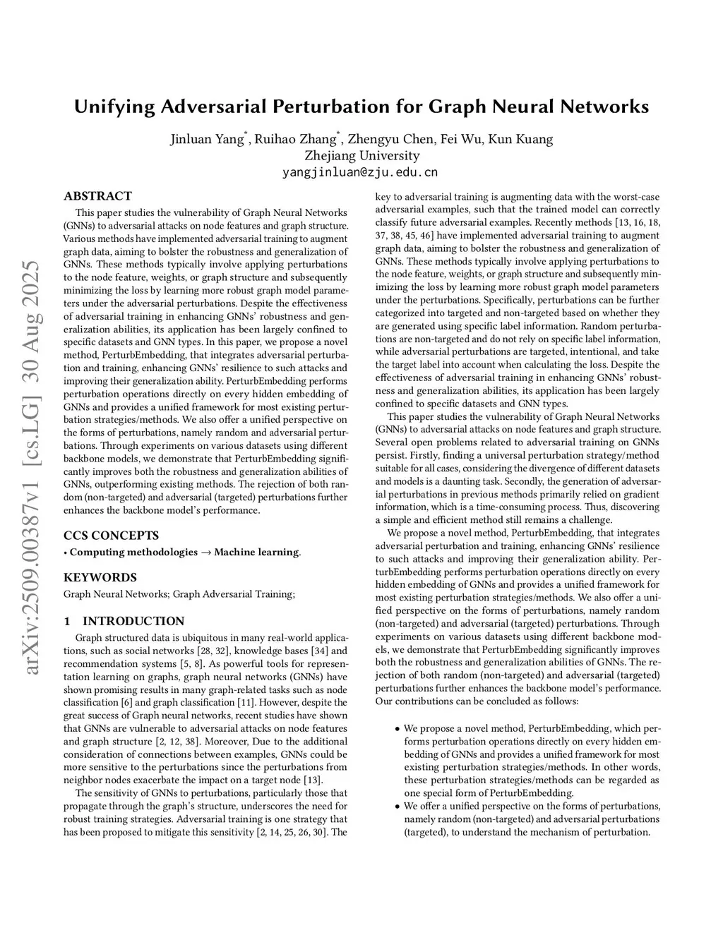 This paper studies the vulnerability of Graph Neural Networks (GNNs) to adversarial attacks on node features and graph structure. Various methods have implemented adversarial training to augment graph data, aiming to bolster the robustness and generalization of GNNs. These methods typically involve applying perturbations to the node feature, weights, or graph structure and subsequently minimizing the loss by learning more robust graph model parameters under the adversarial perturbations. Despite the effectiveness of adversarial training in enhancing GNNs' robustness and generalization abilities, its application has been largely confined to specific datasets and GNN types. In this paper, we propose a novel method, PerturbEmbedding, that integrates adversarial perturbation and training, enhancing GNNs' resilience to such attacks and improving their generalization ability. PerturbEmbedding performs perturbation operations directly on every hidden embedding of GNNs and provides a unified framework for most existing perturbation strategies/methods. We also offer a unified perspective on the forms of perturbations, namely random and adversarial perturbations. Through experiments on various datasets using different backbone models, we demonstrate that PerturbEmbedding significantly improves both the robustness and generalization abilities of GNNs, outperforming existing methods. The rejection of both random (non-targeted) and adversarial (targeted) perturbations further enhances the backbone model's performance.
