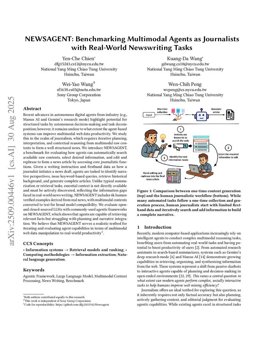 Recent advances in autonomous digital agents from industry (e.g., Manus AI and Gemini's research mode) highlight potential for structured tasks by autonomous decision-making and task decomposition; however, it remains unclear to what extent the agent-based systems can improve multimodal web data productivity. We study this in the realm of journalism, which requires iterative planning, interpretation, and contextual reasoning from multimodal raw contents to form a well structured news. We introduce NEWSAGENT, a benchmark for evaluating how agents can automatically search available raw contents, select desired information, and edit and rephrase to form a news article by accessing core journalistic functions. Given a writing instruction and firsthand data as how a journalist initiates a news draft, agents are tasked to identify narrative perspectives, issue keyword-based queries, retrieve historical background, and generate complete articles. Unlike typical summarization or retrieval tasks, essential context is not directly available and must be actively discovered, reflecting the information gaps faced in real-world news writing. NEWSAGENT includes 6k human-verified examples derived from real news, with multimodal contents converted to text for broad model compatibility. We evaluate open- and closed-sourced LLMs with commonly-used agentic frameworks on NEWSAGENT, which shows that agents are capable of retrieving relevant facts but struggling with planning and narrative integration. We believe that NEWSAGENT serves a realistic testbed for iterating and evaluating agent capabilities in terms of multimodal web data manipulation to real-world productivity.