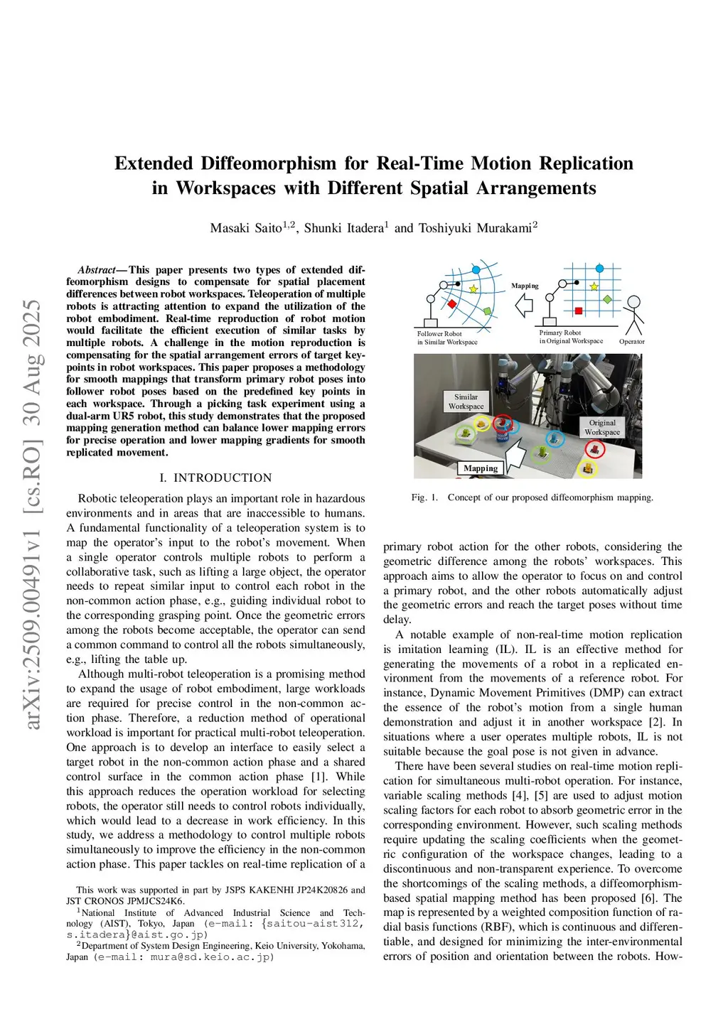 This paper presents two types of extended diffeomorphism designs to compensate for spatial placement differences between robot workspaces. Teleoperation of multiple robots is attracting attention to expand the utilization of the robot embodiment. Real-time reproduction of robot motion would facilitate the efficient execution of similar tasks by multiple robots. A challenge in the motion reproduction is compensating for the spatial arrangement errors of target keypoints in robot workspaces. This paper proposes a methodology for smooth mappings that transform primary robot poses into follower robot poses based on the predefined key points in each workspace. Through a picking task experiment using a dual-arm UR5 robot, this study demonstrates that the proposed mapping generation method can balance lower mapping errors for precise operation and lower mapping gradients for smooth replicated movement.