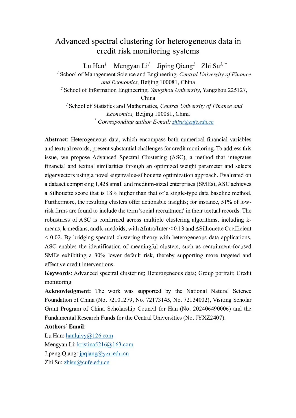 Heterogeneous data, which encompass both numerical financial variables and textual records, present substantial challenges for credit monitoring. To address this issue, we propose Advanced Spectral Clustering (ASC), a method that integrates financial and textual similarities through an optimized weight parameter and selects eigenvectors using a novel eigenvalue-silhouette optimization approach. Evaluated on a dataset comprising 1,428 small and medium-sized enterprises (SMEs), ASC achieves a Silhouette score that is 18% higher than that of a single-type data baseline method. Furthermore, the resulting clusters offer actionable insights; for instance, 51% of low-risk firms are found to include the term 'social recruitment' in their textual records. The robustness of ASC is confirmed across multiple clustering algorithms, including k-means, k-medians, and k-medoids, with {\Delta}Intra/Inter < 0.13 and {\Delta}Silhouette Coefficient < 0.02. By bridging spectral clustering theory with heterogeneous data applications, ASC enables the identification of meaningful clusters, such as recruitment-focused SMEs exhibiting a 30% lower default risk, thereby supporting more targeted and effective credit interventions.
