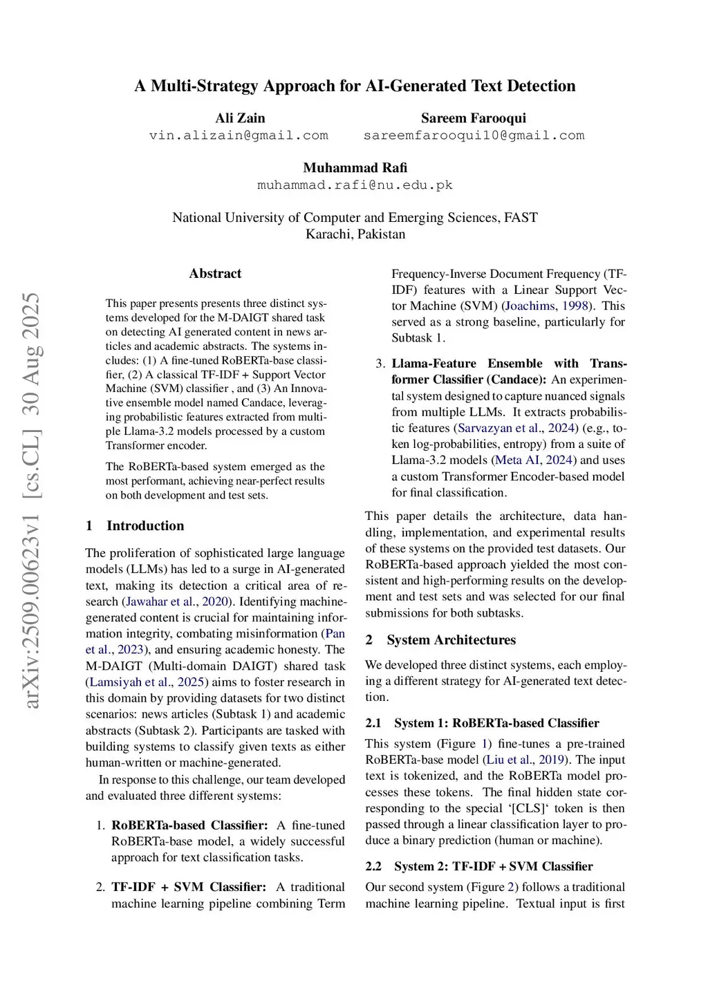This paper presents presents three distinct systems developed for the M-DAIGT shared task on detecting AI generated content in news articles and academic abstracts. The systems includes: (1) A fine-tuned RoBERTa-base classifier, (2) A classical TF-IDF + Support Vector Machine (SVM) classifier , and (3) An Innovative ensemble model named Candace, leveraging probabilistic features extracted from multiple Llama-3.2 models processed by a customTransformerthis http URLRoBERTa-based system emerged as the most performant, achieving near-perfect results on both development and test sets.