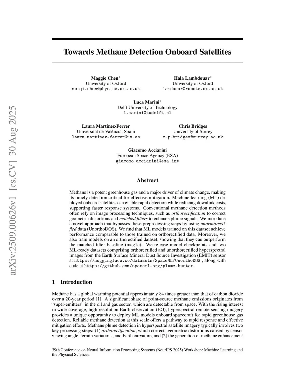 Methane is a potent greenhouse gas and a major driver of climate change, making its timely detection critical for effective mitigation. Machine learning (ML) deployed onboard satellites can enable rapid detection while reducing downlink costs, supporting faster response systems. Conventional methane detection methods often rely on image processing techniques, such as orthorectification to correct geometric distortions and matched filters to enhance plume signals. We introduce a novel approach that bypasses these preprocessing steps by using \textit{unorthorectified} data (UnorthoDOS). We find that ML models trained on this dataset achieve performance comparable to those trained on orthorectified data. Moreover, we also train models on an orthorectified dataset, showing that they can outperform the matched filter baseline (mag1c). We release model checkpoints and two ML-ready datasets comprising orthorectified and unorthorectified hyperspectral images from the Earth Surface Mineral Dust Source Investigation (EMIT) sensor atthis https URL, along with code atthis https URL.