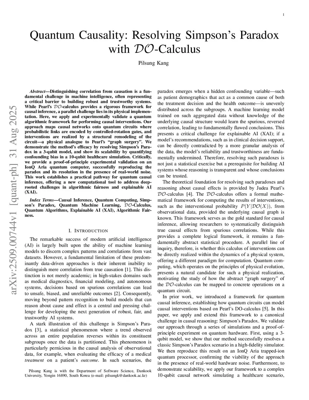 Distinguishing correlation from causation is a central challenge in machine intelligence, and Pearl's -calculus provides a rigorous symbolic framework for reasoning about interventions. A complementary question is whether such intervention logic can be given \emph{executable semantics} on physical quantum devices. Our approach maps causal networks onto quantum circuits, where nodes are encoded in qubit registers, probabilistic links are implemented by controlled-rotation gates, and interventions are realized by a structural remodeling of the circuit -- a physical analogue of Pearl's ``graph surgery'' that we term \emph{circuit surgery}. We show that, for a family of 3-node confounded treatment models (including a Simpson-type reversal), the post-surgery circuits reproduce exactly the interventional distributions prescribed by the corresponding classical -calculus. We then demonstrate a proof-of-principle experimental realization on an IonQ Aria trapped-ion processor and a 10-qubit synthetic healthcare model, observing close agreement between hardware estimates and classical baselines under realistic noise. We do not claim quantum speedup; instead, our contribution is to establish a concrete pathway by which causal graphs and Pearl-style interventions can be represented, executed, and empirically tested within the formalism of quantum circuits.