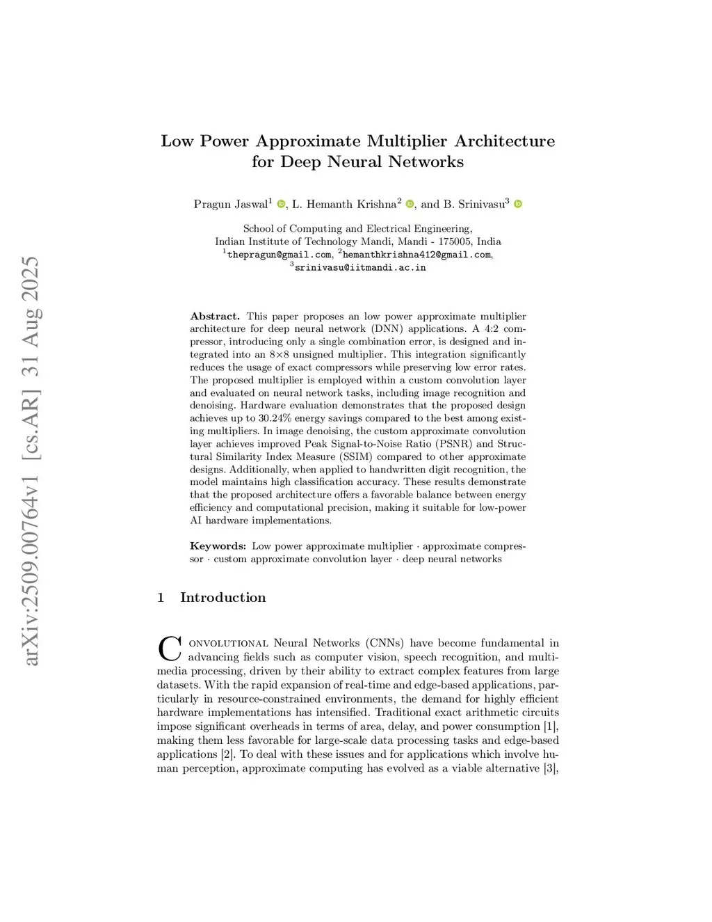 This paper proposes an low power approximate multiplier architecture for deep neural network (DNN) applications. A 4:2 compressor, introducing only a single combination error, is designed and integrated into an 8x8 unsigned multiplier. This integration significantly reduces the usage of exact compressors while preserving low error rates. The proposed multiplier is employed within a custom convolution layer and evaluated on neural network tasks, including image recognition and denoising. Hardware evaluation demonstrates that the proposed design achieves up to 30.24% energy savings compared to the best among existing multipliers. In image denoising, the custom approximate convolution layer achieves improved Peak Signal-to-Noise Ratio (PSNR) and Structural Similarity Index Measure (SSIM) compared to other approximate designs. Additionally, when applied to handwritten digit recognition, the model maintains high classification accuracy. These results demonstrate that the proposed architecture offers a favorable balance between energy efficiency and computational precision, making it suitable for low-power AI hardware implementations.